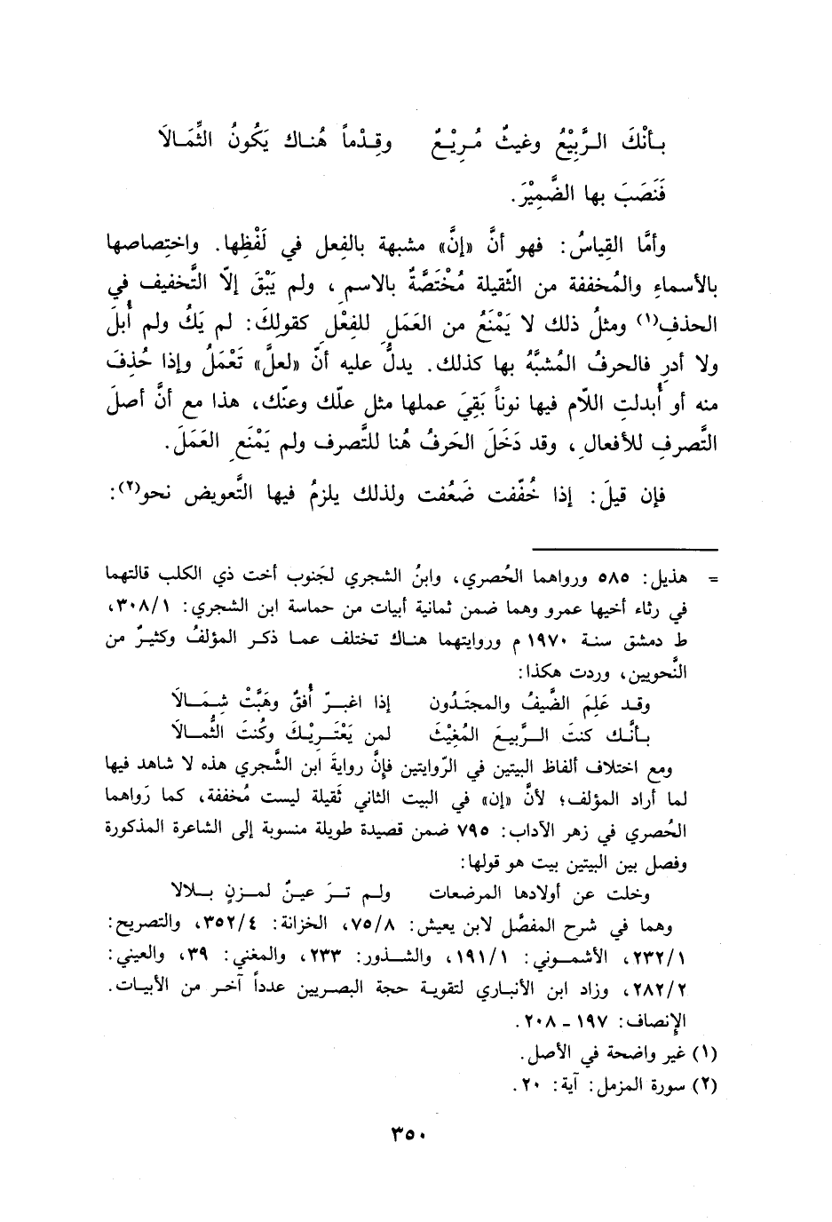 وأمَّا القِياسُ: فهو أنَّ ((إنَّ)) مشبهة بالفِعل في لَفْظِها. واختِصاصها بالأسماءِ والمُخففة من الثّقيلة مُخْتَصَّةٌ بالاسمِ، ولم يَبْقَ إلاّ التَّخفيف في الحذفِ ومثلُ ذلك لا يَمْنَعُ من العَمَلِ للفِعْلِ كقولِكَ: لم يَكُ ولم أُبلَ ولا أدرِ فالحرفُ المُشبَّهُ بها كذلك. يدلُّ عليه أنّ ((لعلَّ)) تَعْمَلُ وإذا حُذِفَ منه أو أُبدلتِ اللاّم فيها نوناً بَقِيَ عملها مثل علّك وعنّك، هذا مع أنَّ أصلَ التَّصرفِ للأفعالِ، وقد دَخَلَ الحَرفُ هُنا للتَّصرف ولم يَمْنَعِ العَمَلَ.