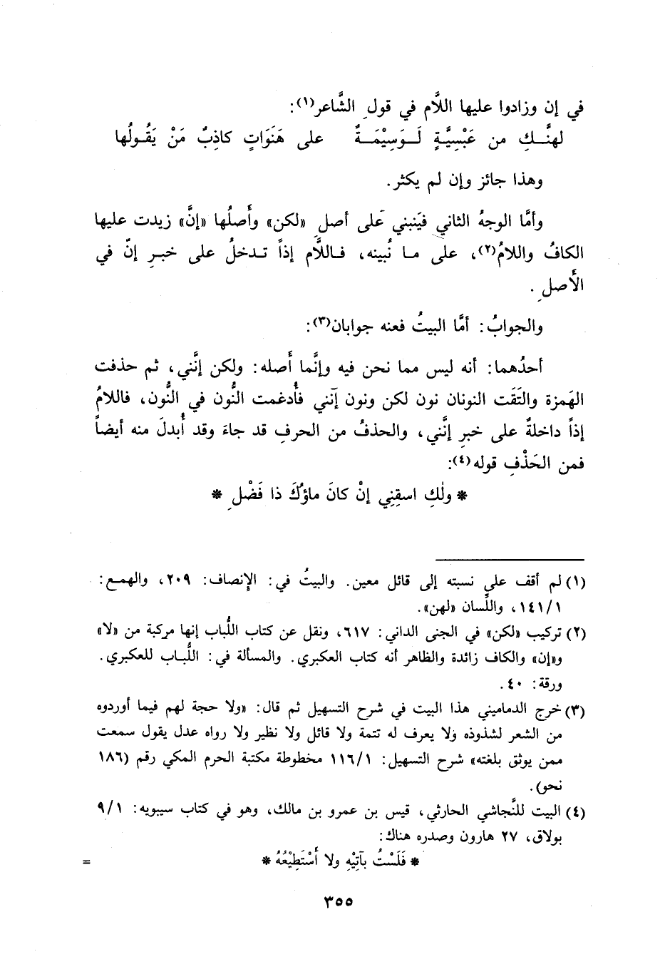 أحدُهما: أنه ليس مما نحن فيه وإنَّما أَصله: ولكن إنَّني، ثم حذفت الهَمزة والتَقَت النونان نون لكن إنني فأُدغمت النُّون في النُّون، فاللامُ إذاً داخلةٌ على خبرِ إنَّني، والحذفُ من الحرفِ قد جاءَ وقد أُبدل منه أيضاً فمن الحَذْفِ قوله:
