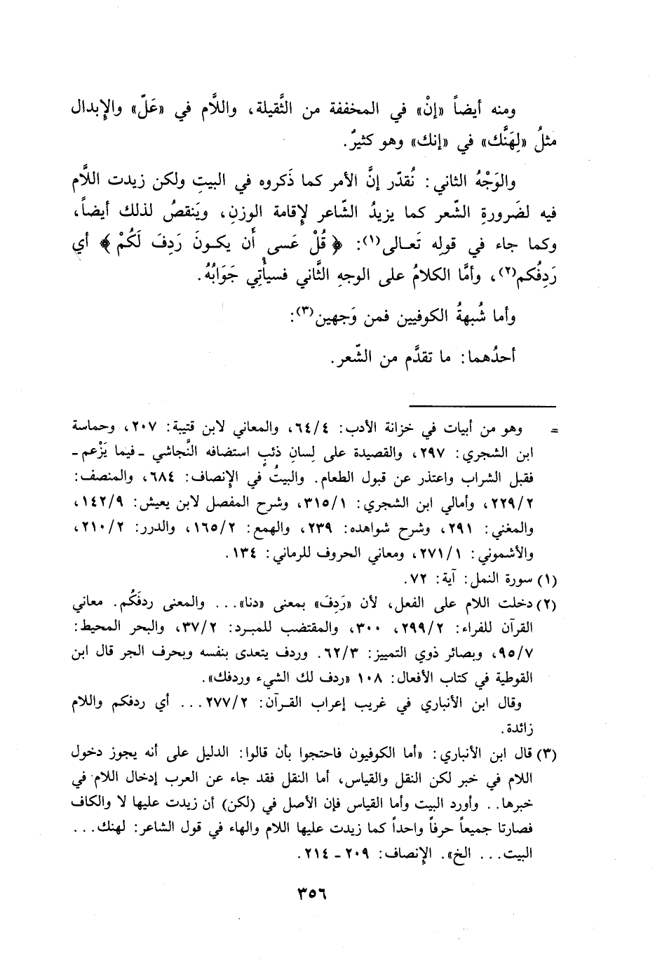 والوَجْهُ الثاني: نُقدّر إنَّ الأمر كما ذَكروه في البيتِ ولكن زيدت اللاَّم فيه لضَرورةِ الشّعر كما يزيدُ الشّاعر لإِقامة الوزنِ، ويَنقضُ لذلك أيضاً، وكما جاء في قولِه تَعالى: {قُلْ عَسى أَن يكونَ رَدِفَ لَكُمْ} أي رَدِفُكم، وأمَّا الكلامُ على الوجهِ الثَّاني فسياتِي جَوَابُهُ.