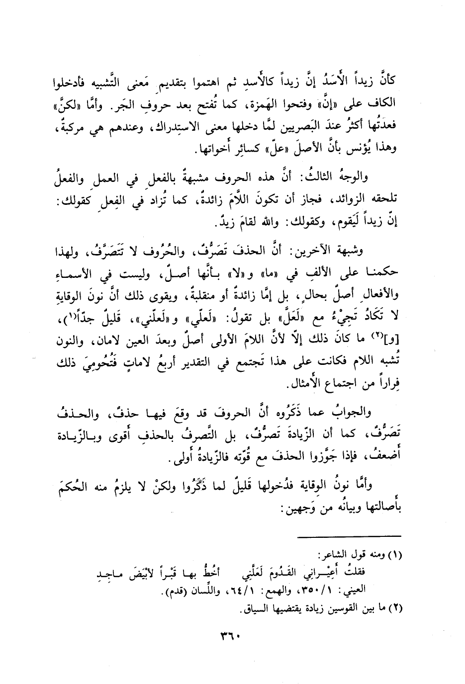 والجوابُ عما ذَكَرُوه أنَّ الحروفَ قد وقعَ فيها حذفٌ، والحذفُ تَصَرُّفٌ، كما أن الزّيادةَ تَصرُّفٌ، بل التَّصرفُ بالحذفِ أَقوى وبالزّيادة أَضعفُ، فإذا جَوَّزوا الحذفَ مع قُوَّته فالزّيادةُ أَولى.
