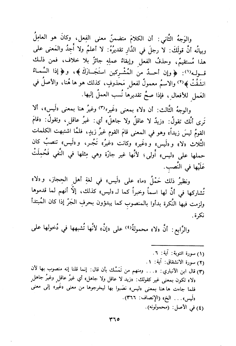 والوجهُ الثَّالث: أن ((لا)) بمعنى ((غَير)) وغيرُ هنا بمعنى ((لَيس))، ألا تَرى أنَّك تقولُ: ((زيدٌ لا عاقلٌ ولا جاهلٌ)) أي: غيرُ عاقلٍ، وتقولُ: ((قامَ القومُ ليسَ زيداً)) وهو في المعنى قامَ القوم غيرُ زيدٍ، فلمَّا اشتبهت الكلمات الثَّلاث ((لا)) و ((لَيس)) و ((غَير)) وكانت ((غيرُ)) تَجُر، و ((لَيس)) تنصبُ كان حملها على ((ليس)) أَولى؛ لأنَّها غير جارّة وهي مِثلها في النَّفي فَحُمِلَتْ عَلَيْها في النَّصبِ.