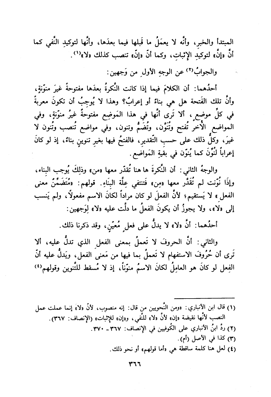 أحدُهما: أن الكلامَ فيما إذا كانت النَّكرةُ بعدَها مفتوحةً غيرَ منوّنةٍ، وأنَّ تلك الفَتحة هل هي بناءٌ أو إعرابٌ؟ وهذا لا يُوجِبُ أن تكونَ معربةً في كلِّ موضعٍ، ألا تَرى أنَّها في هذا المَوضِع مفتوحةٌ غيرُ منوّنةٍ، وفي المواضع الأُخر تُفتح وتُنَوَّن، وتَضَمُّ وتنون، وفي مواضع تُنصب وتُنون لا غيرَ، وكلُّ ذلك على حسبِ التّقديرِ، فالفتحُ فيها بغيرِ تنوينٍ بناءٌ، إذ لو كانَ إعراباً لنُوِّنَ كما يُنوّن في بقيةِ المَواضع.