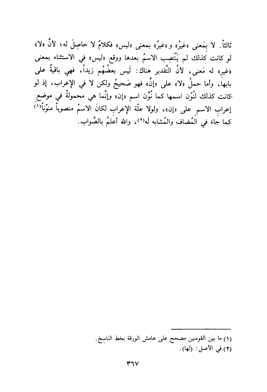 ثالثاً. لا بِمَعنى ((غيرُ)) و ((غيرُ)) بمعنى ((ليس)) فكلامٌ لا حاصِلَ له؛ لأنَّ ((لا)) لو كانت كذلك لم يَنْتَصِب الاسمُ بعدها ووقع ((ليس)) في الاستثناء بمعنى ((غيرِ)) له مَعنى، لأنَّ التَّقدير هناك: لَيس بعضُهُم زيداً، فهي باقيةٌ على بابها، وأما حملُ ((لا)) على ((إنَّ)) فهو صَحيحٌ ولكن لا في الإِعراب، إذ لو كانت كذلك لنُوّن اسمها كما نُوِّن اسم ((إن)) وإنَّما هي محمولةٌ في موضعِ إعرابِ الاسمِ على ((إن))، ولولا علّة الإِعرابِ لكانَ الاسمُ منصوباً منوّناً كما جاءَ في المُضاف والمُشابه لَه، والله أعلمُ بالصَّواب.