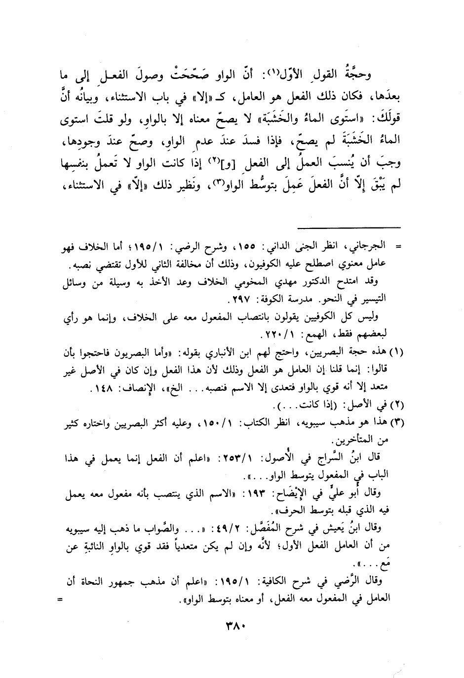 وحجَّةُ القولِ الأوّل: أنّ الواو صَحّحَتْ وصولَ الفعلِ إلى ما بعدَها، فكان الفعل هو العامل، كـ ((إلا)) في باب الاستثناء، وبيانُه أنَّ قولَكَ: ((استَوى الماءُ والخَشَبَة)) لا يصحّ معناه إلا بالواوِ، ولو قلتَ استوى الماءُ الخَشَبَةَ لم يصحّ، فإذا فسدَ عندَ عدمِ الواوِ، وصحّ عندَ وجودِها، وجبَ أن يُنسبَ العملُ إلى الفعلِ [و] إذا كانت الواو لا تَعملُ بنفسِها لم يَبْقَ إِلاّ أنَّ الفعلَ عَمِلَ بتوسُّط الواو، ونَظير ذلك ((إلاّ)) في الاستثناء،