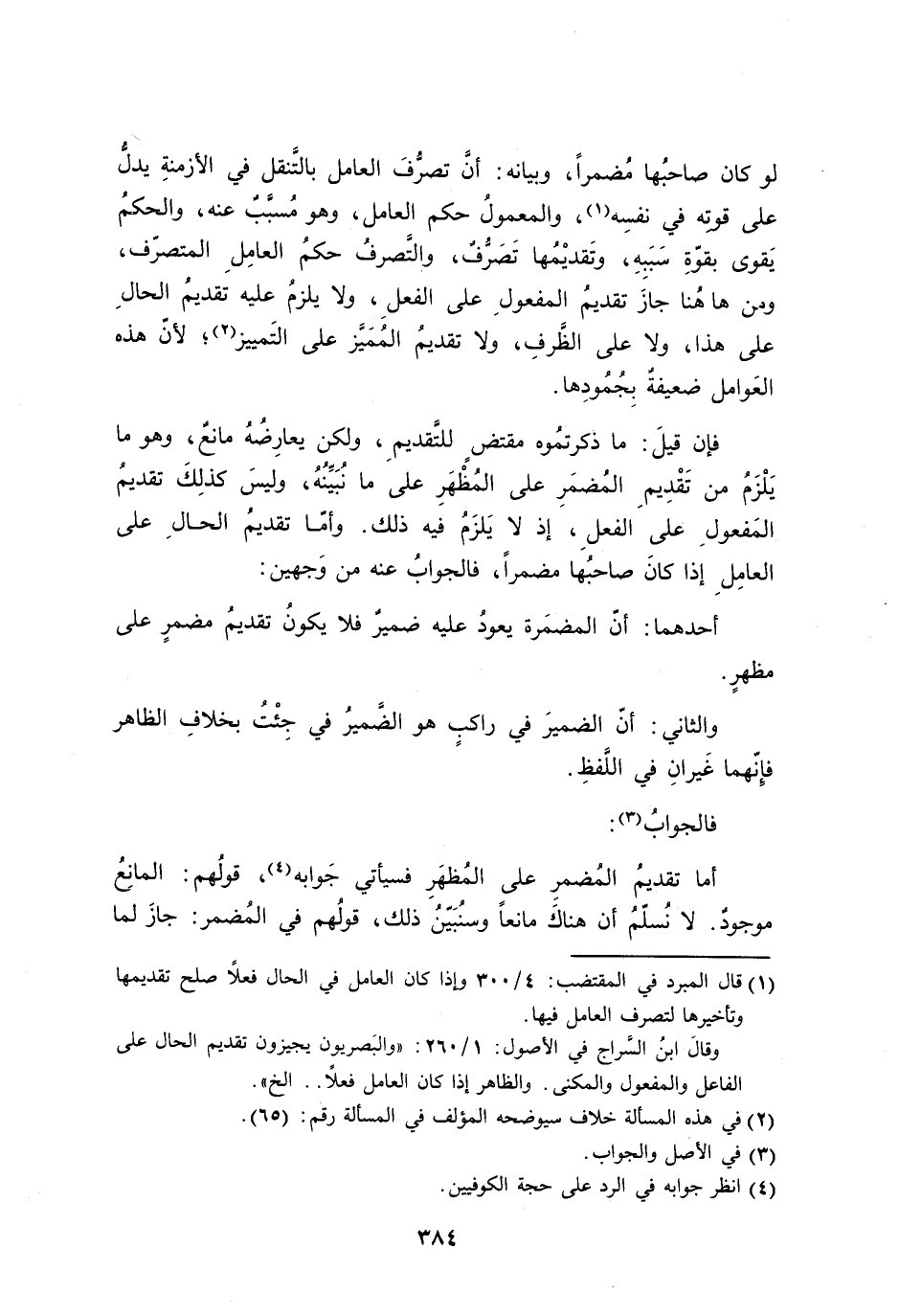 فإن قيلَ: ما ذكرتمُوه مقتضٍ للتَّقديمِ، ولكن يعارضُهُ مانعٌ، وهو ما يَلْزَمُ من تَقْدِيمِ المُضمَرِ على المُظْهَرِ على ما نُبَيِّنُهُ، وليسَ كذلكَ تقديمُ المَفعولِ على الفعلِ، إذ لا يَلزَمُ فيه ذلك. وأمّا تقديمُ الحالِ على العاملِ إذا كانَ صاحبُها مضمراً، فالجوابُ عنه من وَجهين: