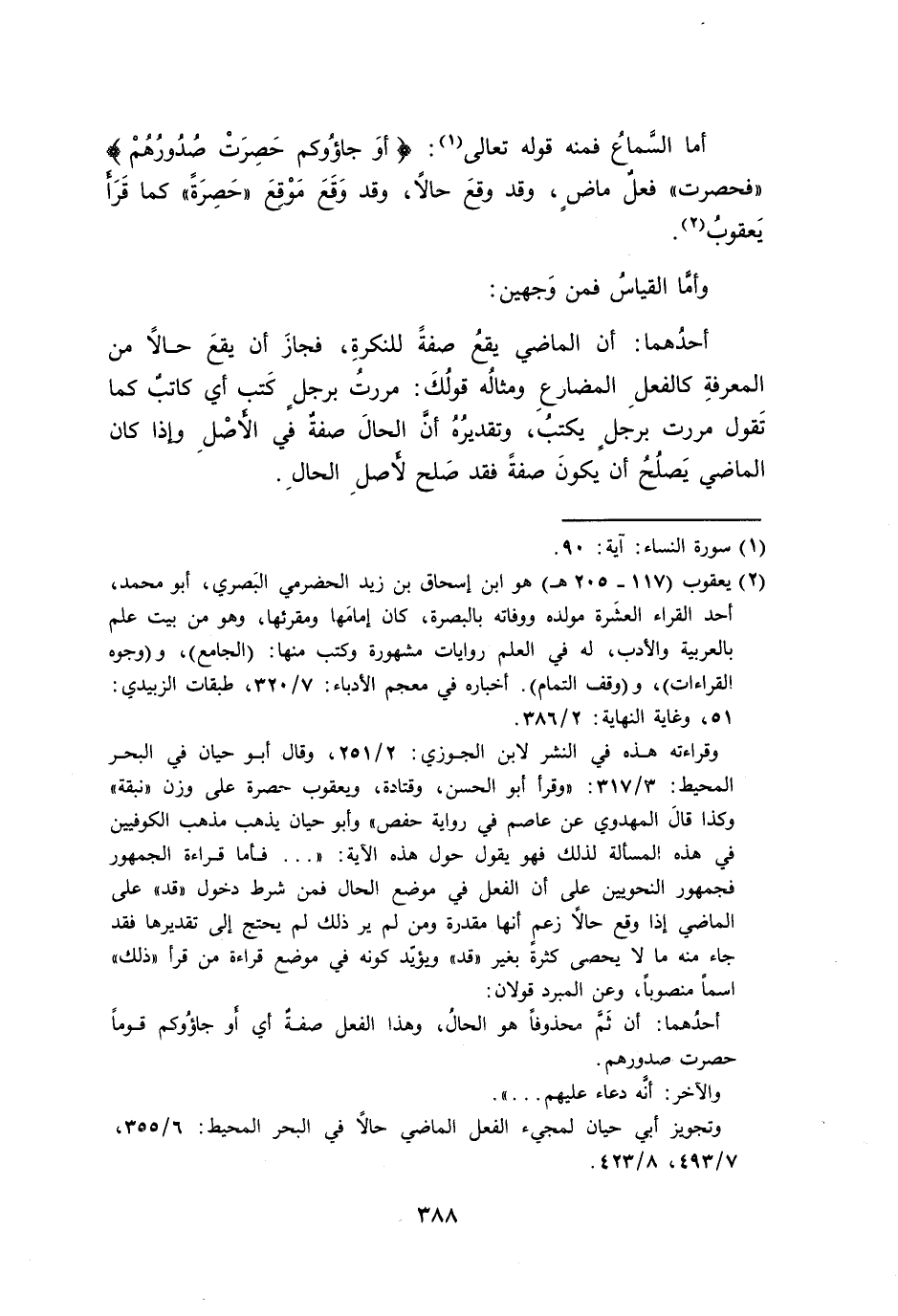 أما السَّماعُ فمنه قوله تعالى: {أوَ جاؤُوكم حَصِرَتْ صُدُورُهُمْ} ((فحصرت)) فعلٌ ماضٍ، وقد وقعَ حالاً، وقد وَقَعَ مَوْقَعَ ((حَصِرَةً)) كما قَرَأَ يَعقوبُ.