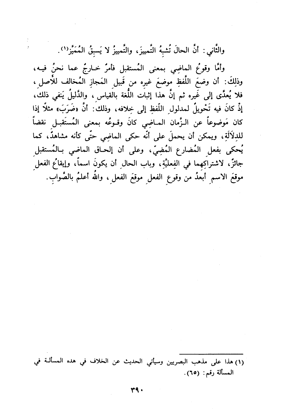 وأمَّا وقوعُ الماضِي بمعنى المُستقبل فأمرٌ خارجٌ عما نحنُ فيه، وذلِكَ: أن وضعَ اللَّفظِ موضعَ غيرِه من قَبيلِ المَجازِ المُخالف للأَصلِ، فلا يُعدَّى إلى غَيره ثم إنَّ هذا إثبات اللُّغة بالقياسِ، والدَّليلُ يَنفي ذلك، إذْ كانَ فيه تَحْويلٌ لمدولولِ اللّفظِ إلى خِلافه، وذلك: أنَّ ((ضَرَبَ)) مثلاً إذا كان مَوضوعاً عن الزَّمان الماضِي كانَ وقوعُه بمعنى المُستَقبلِ نقضاً للدِلاَلَةِ، ويمكن أن يحملَ على أنّه حكى الماضِي حتّى كأنه مشاهدٌ، كما يُحكى بفعلِ المُضارع المُضِيّ، وعلى أن إلحاق الماضي بالمُستقبلِ جائزٌ، لاشتراكِهِما في الفِعليَّةِ، وباب الحالِ أن يكونَ اسماً، وإيقاعُ الفعلِ موقعَ الاسمِ أبعدُ من وقوعِ الفعلِ موقعَ الفعلِ، والله أعلمُ بالصَّوابِ.