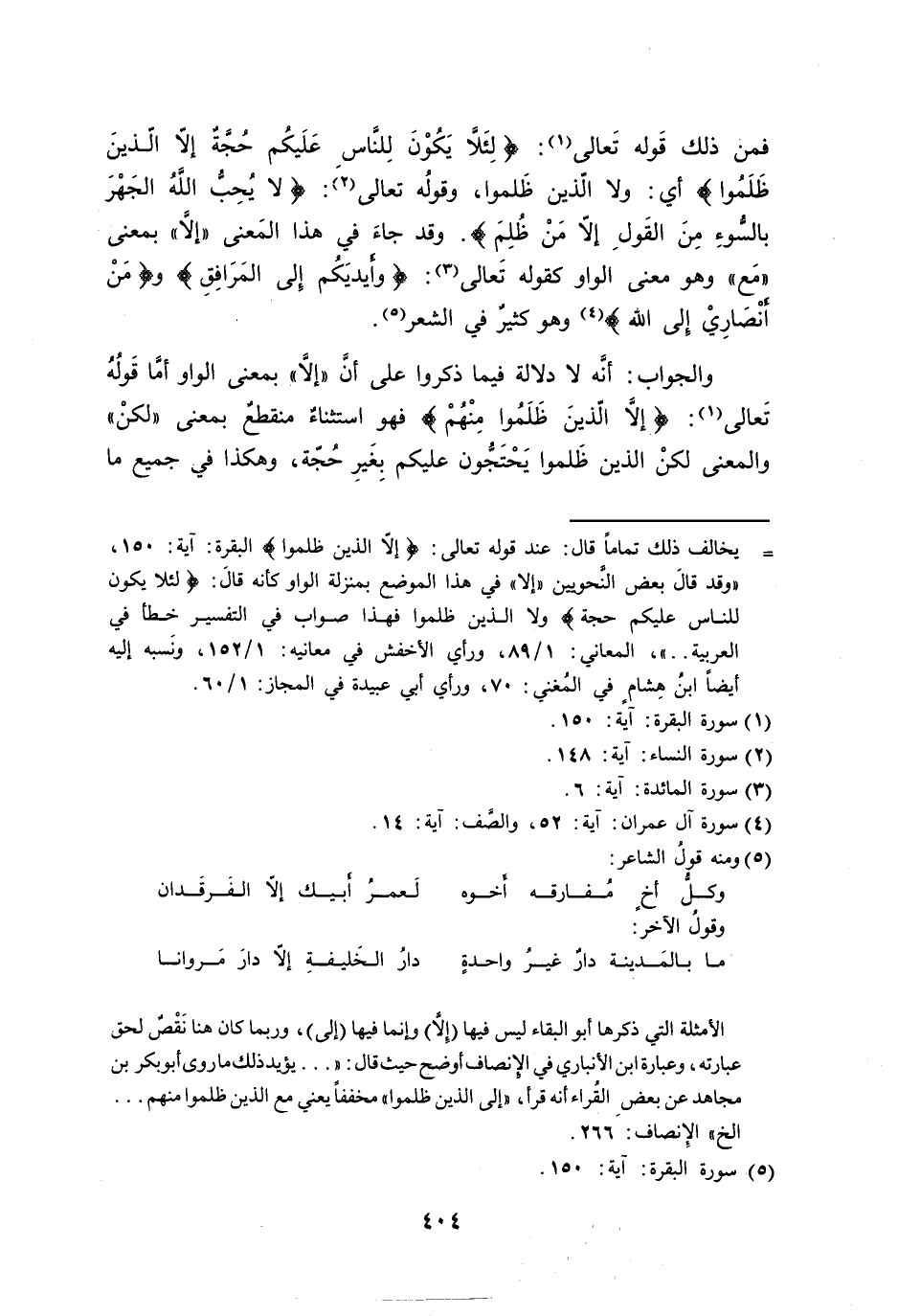 والجواب: أنَّه لا دلالة فيما ذكروا على أنَّ ((إلاَّ)) بمعنى الواو أمَّا قَولُهُ تَعالى: {إلاَّ الّذينَ ظَلَمُوا مِنْهُمْ} فهو استثناءٌ منقطعٌ بمعنى ((لكنْ)) والمعنى لكنْ الذين ظَلموا يَحْتَجُّون عليكم بِغَيرِ حُجّة، وهكذا في جميع ما