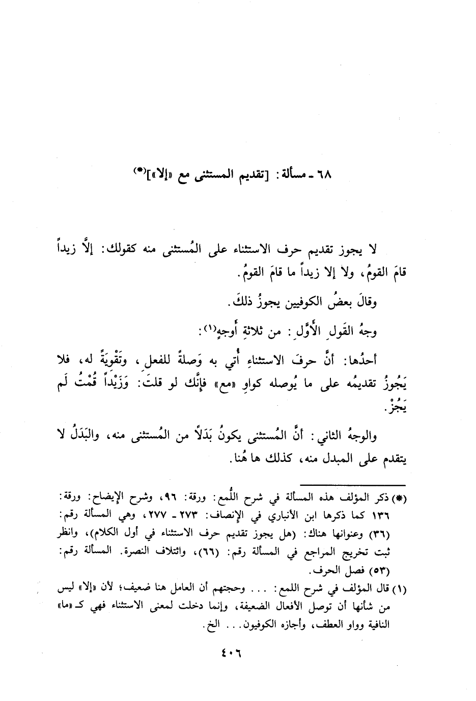 أحدُها: أنَّ حرفَ الاستثناءِ أُتي به وَصلةً للفعلِ، وتَقْوِيَةً له، فلا يَجُوزُ تقديمُه على ما يُوصله كواوِ ((مع)) فإِنَّك لو قلتَ: وَزَيْداً قُمْتُ لَم يَجُزْ.