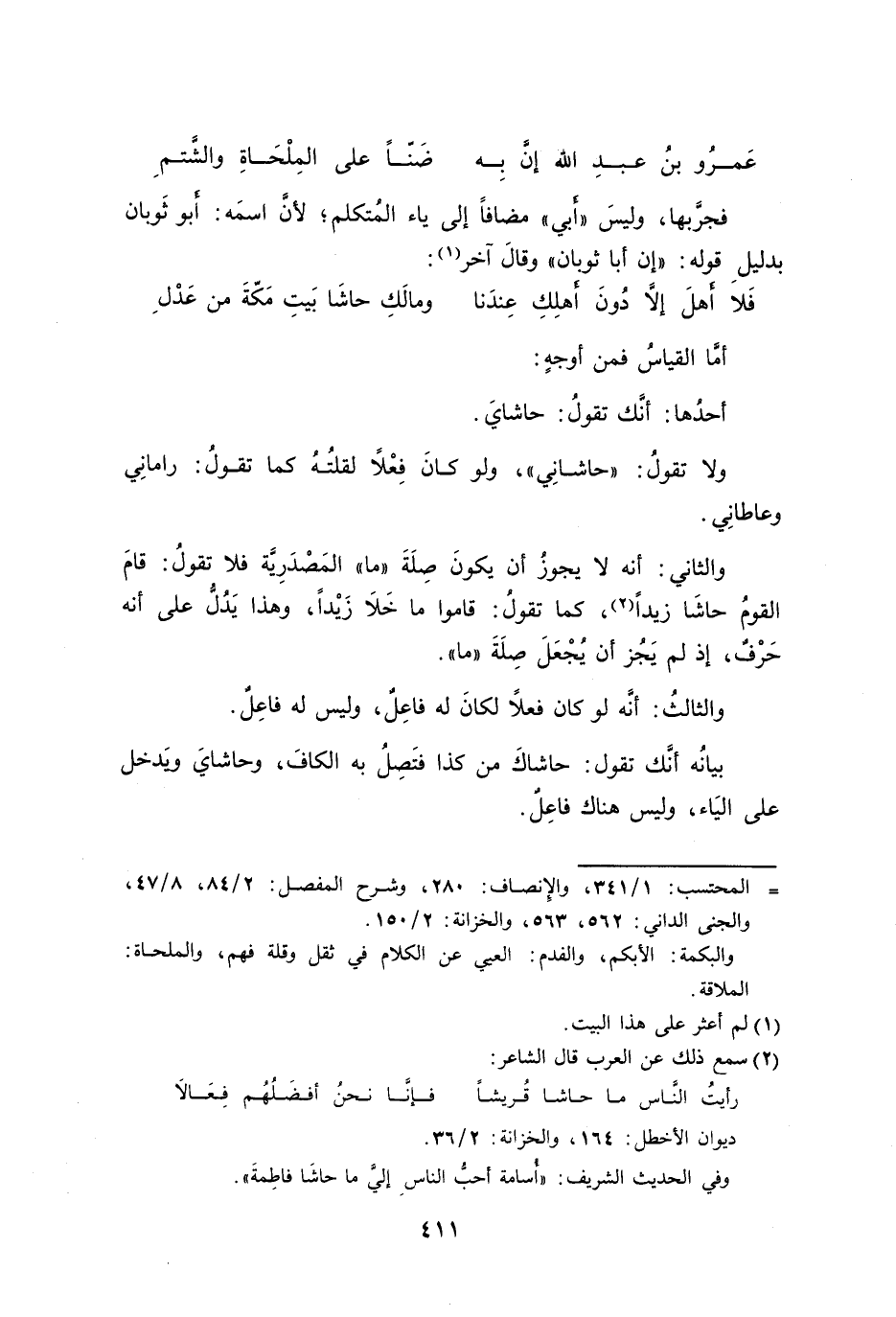 ولا تقولُ: ((حاشانِي))، ولو كانَ فِعْلاً لقتُهُ كما تقولُ: رامانِي وعاطانِي.