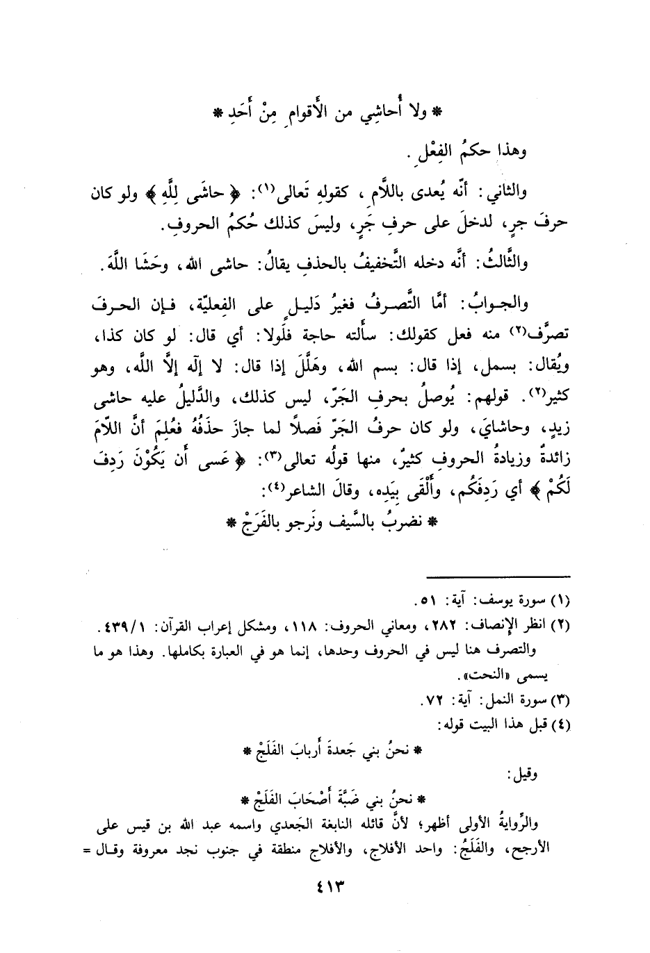 والجوابُ: أمَّا التَّصرفُ فغيرُ دَليلٍ على الفِعليّة، فإن الحرفَ تصرَّف منه فعل كقولك: سأَلته حاجة فلَولا: أي قال: لو كان كذا، ويُقال: بسمل، إذا قال: بسم الله، وهَلَّلَ إذا قال: لا إلَه إلاَّ الله، وهو كثير. قولهم: يُوصلُ بحرفِ الجَرّ، ليس كذلك، والدَّليلُ عليه حاشى زيدٍ، وحاشايَ، ولو كان حرفُ الجَرّ فَصلاً لما جازَ حذَفُهُ فعُلِمَ أنَّ اللاّمَ زائدةٌ وزيادةُ الحروفِ كثيرٌ، منها قولُه تعالى: {عَسى أَن يَكُوْنَ رَدِفَ لَكُمْ} أي رَدِفَكُم، وأَلْقَى بِيَدِه، وقالَ الشاعر: