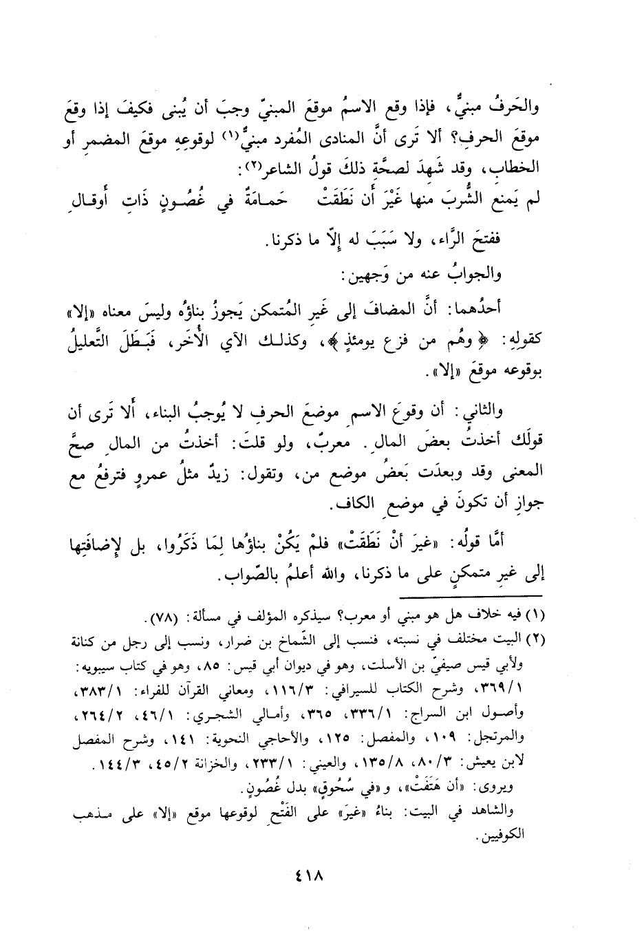 أمَّا قولُه: ((غيرَ أنْ نَطَقَتْ)) فلمْ يَكُنْ بناؤُها لِمَا ذَكَرُوا، بل لإِضافَتِها إلى غيرِ متمكنٍ على ما ذكرنا، والله أعلمُ بالصّواب.