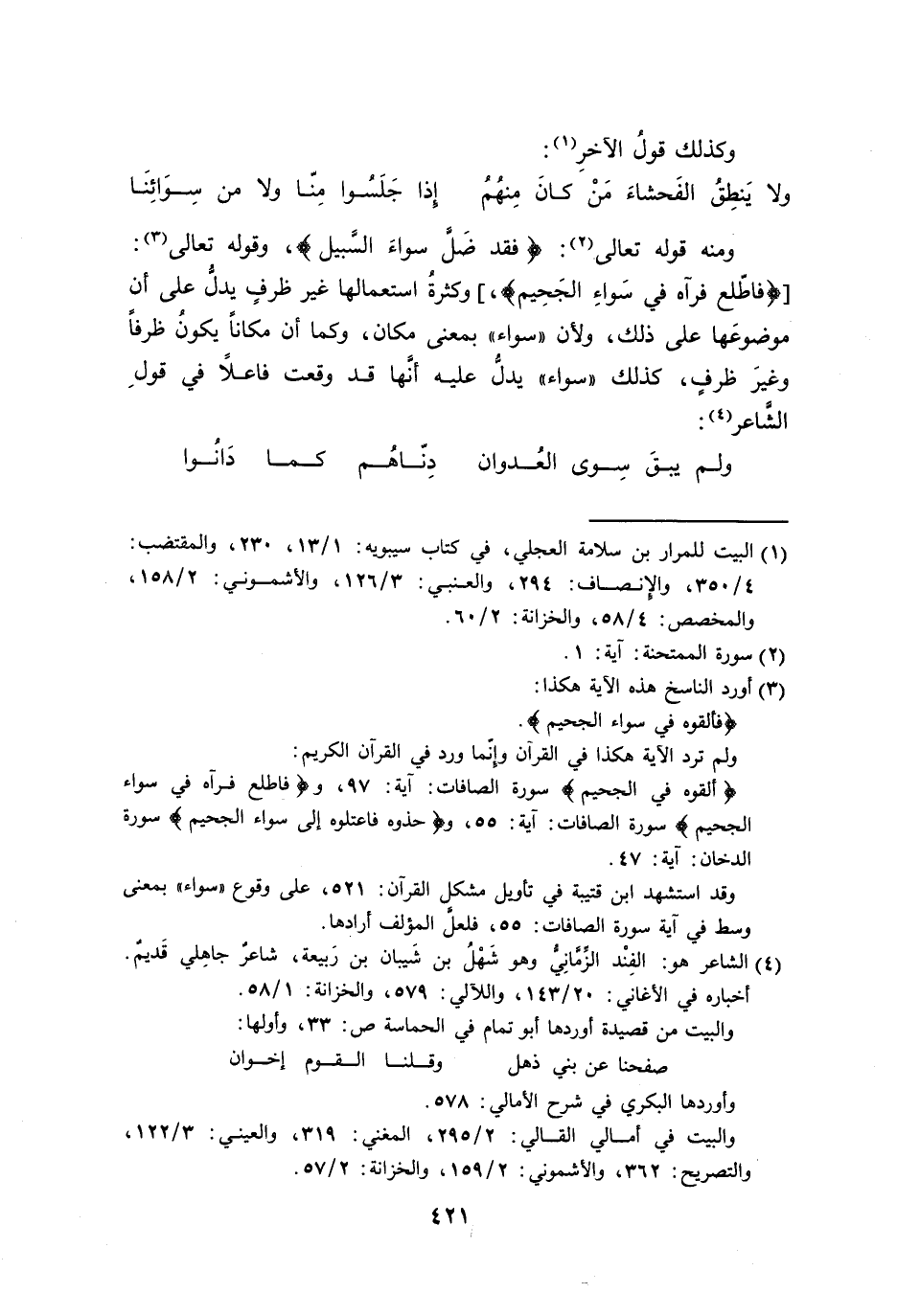 ومنه قوله تعالى: {فقد ضَلَّ سواءَ السَّبيل}، وقوله تعالى: [{فاطّلع فرآه في سَواءِ الجَحيمِ}،] وكثرةُ استعمالها غير ظرفٍ يدلُّ على أن موضوعَها على ذلك، ولأن ((سواء)) بمعنى مكان، وكما أن مكاناً يكونُ ظرفاً وغيرَ ظرفٍ، كذلك ((سواء)) يدلُّ عليه أنَّها قد وقعت فاعلاً في قولِ الشَّاعر: