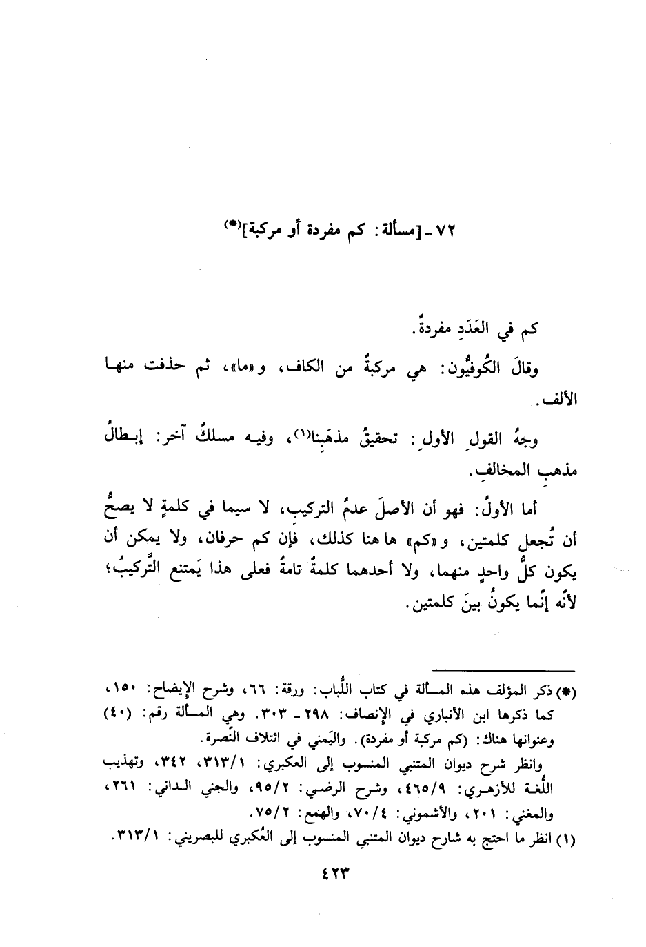 أما الأولُ: فهو أن الأصل عدمُ التركيبِ، لا سيما في كلمةٍ لا يصحُّ أن تُجعل كلمتين، و ((كم)) هاهنا كذلك، فإن كم حرفان، ولا يمكن أن يكون كلُّ واحدٍ منهما، ولا أحدهما كلمةٌ تامةٌ فعلى هذا يَمتنع التَّركيبُ؛ لأنّه إنّما يكونُ بينَ كلمتين.