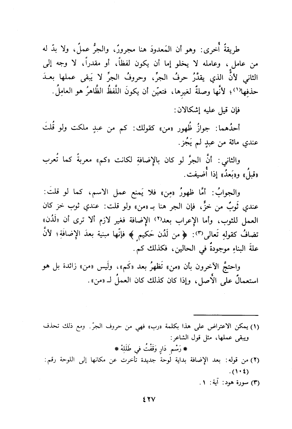 والجوابُ: أمَّا ظهورُ ((مِن)) فلا يَمنع عمل الاسم، كما لو قلتَ: عندي ثَوبٌ من خزٍّ، فإن الجر هنا بـ ((من)) ولو قلت: عندي ثوب خز كان العمل للثوب، وأما الإِعراب بعد الإِضافة فغير لازم ألا ترى أن ((لَدُن)) تضافُ كقولِهِ تَعالى: {من لَدُن حَكيمٍ} فإنّها مبينة بعدَ الإِضافَةِ؛ لأنَّ علةَ البناءِ موجودةٌ في الحالين، فكذلك كم.