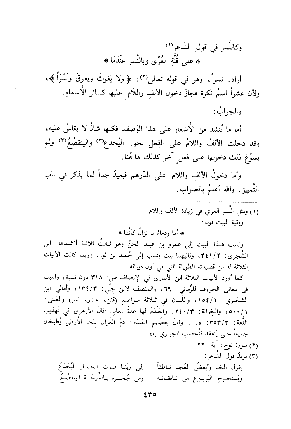 أما ما يُنشد من الأَشعار على هذا الوَصف فكلها شاذٌّ لا يقاسُ عليه، وقد دخلت الألفُ واللامُ على الفِعل نحو: اليُجدع واليتقصَّعُ ولم يسوّغ ذلك دخولهما على فعلٍ آخر كذلك هاهُنا.