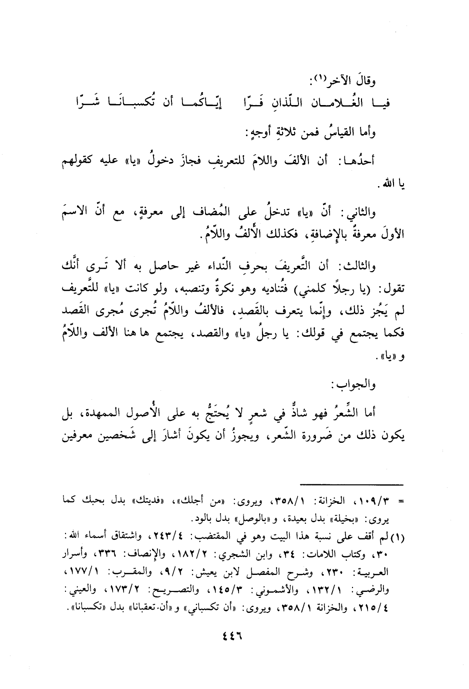 أما الشِّعرُ فهو شاذٌّ في شعرٍ لا يُحتَجُّ به لا الأُصول الممهدة، بل يكون ذلك من ضَرورة الشّعر، ويجوزُ أن يكونَ أشارَ إلى شَخصين معرفين