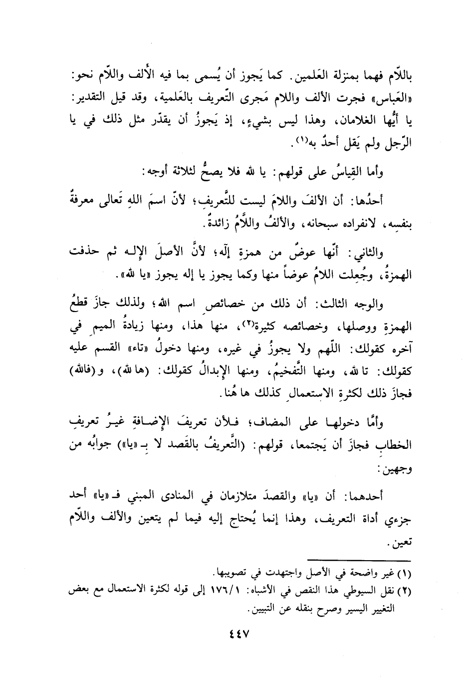 وأما القِياسُ على قولهم: يا الله فلا يصحُّ لثلاثة أوجه: