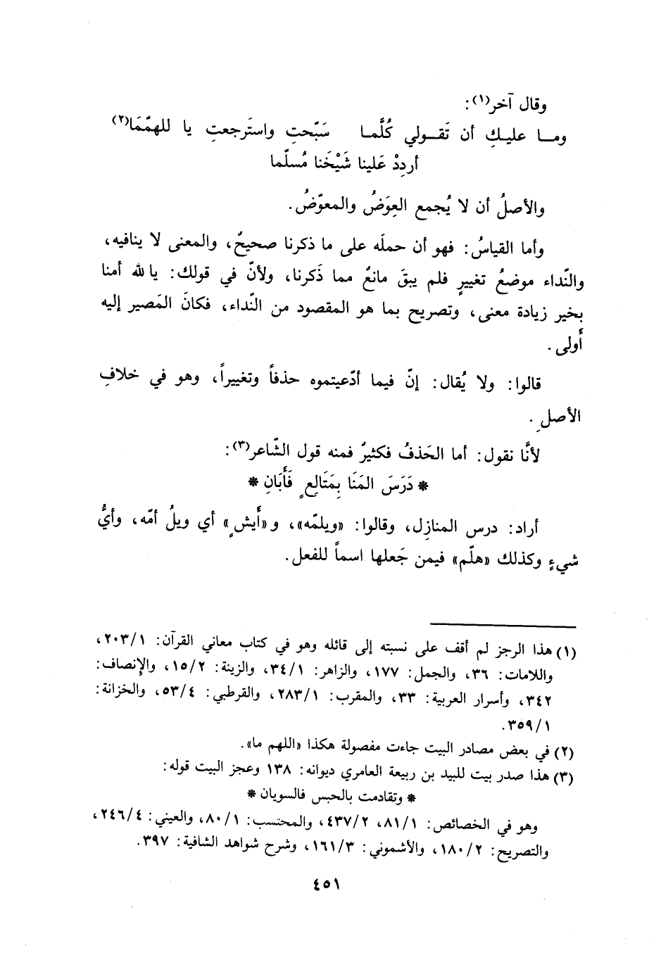 أراد: درس المنازِل، وقالوا: ((ويلمّه))، و ((أَيشٍ)) أي ويلُ أمّه، وأيُّ شيءٍ وكذلك ((هلّم)) فيمن جَعلها اسماً للفعل.
