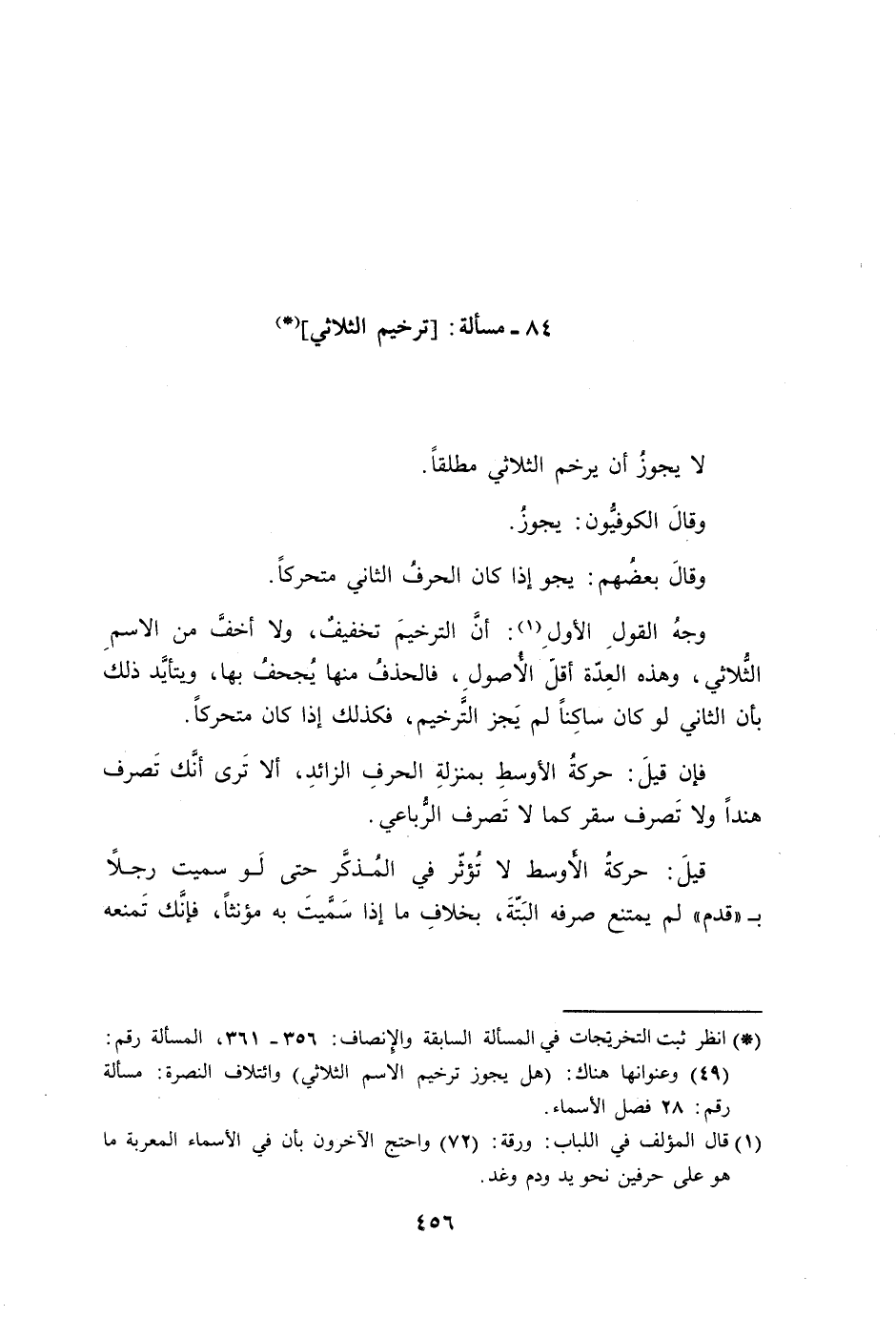 وجهُ القولِ الأولِ: أنَّ الترخيمَ تخفيفٌ، ولا أخفَّ من الاسمِ الثُّلاثي، وهذه العِدّة أقلّ الأُصولِ، فالحذفُ منها يُجحفُ بها، ويتأيَّد ذلك بأن الثاني لو كان ساكِناً لم يَجز التَّرخيم، فكذلك إذا كان متحركاً.