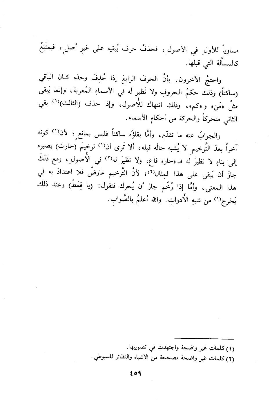 واحتجَّ الآخرون: بأنَّ الحرفَ الرابعَ إذا حُذِفَ وحدَه كان الباقي (ساكناً) وذلك حكمُ الحروفِ ولا نَظير لَه في الأسماءِ المُعربة، وإنما يَبقى مثلُ ((مَن)) و ((كم))، وذلك انتهاك للأُصول، وإذا حذف (الثالث) بقي الثاني متحركاً والحركة من أحكام الأسماء.