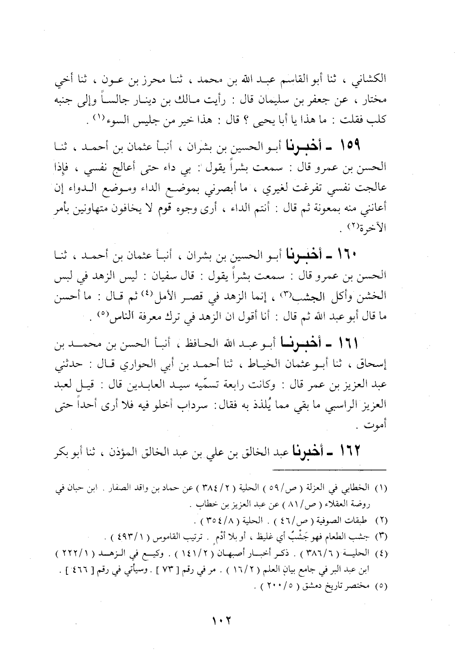 160 - أَخْبَرَنَا أَبُو الْحُسَيْنِ بْنُ بِشْرَانَ، أَنْبَأَنَا عُثْمَانُ بْنُ أَحْمَدَ، حَدَّثَنَا الْحَسَنُ بْنُ عَمْرٍو قَالَ: سَمِعْتُ بِشْرًا يَقُولُ: قَالَ سُفْيَانُ: " §لَيْسَ الزُّهْدُ فِي لُبْسِ الْخَشِنِ وَأَكْلِ الْجَشِبِ، إِنَّمَا الزُّهْدُ فِي قِصَرِ الْأَمَلِ، ثُمَّ قَالَ: مَا أَحْسَنَ مَا قَالَ أَبُو عَبْدِ اللَّهِ ثُمَّ قَالَ: أَنَا أَقُولُ: إِنَّ الزُّهْدَ فِي تَرْكِ مَعْرِفَةِ النَّاسِ "