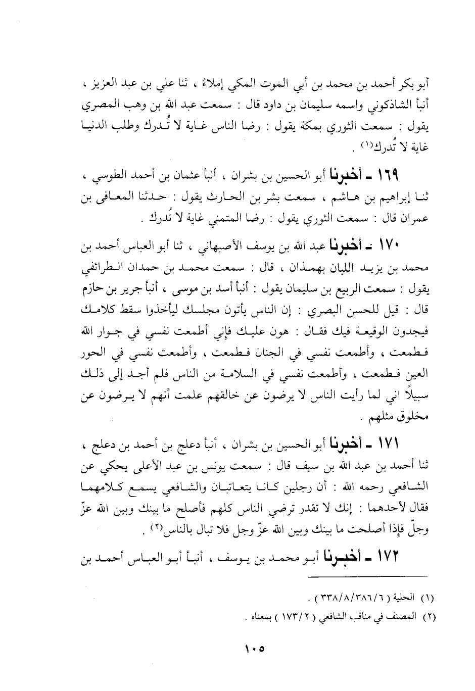 169 - أَخْبَرَنَا أَبُو الْحُسَيْنِ بْنُ بِشْرَانَ، أَنْبَأَنَا عُثْمَانُ بْنُ أَحْمَدَ الطُّوسِيُّ، حَدَّثَنَا إِبْرَاهِيمُ بْنُ هَاشِمٍ، سَمِعْتُ بِشْرَ بْنَ الْحَارِثِ يَقُولُ: حَدَّثَنَا الْمُعَافَى بْنُ عِمْرَانَ قَالَ: سَمِعْتُ الثَّوْرِيَّ يَقُولُ: §«رِضَا الْمُتَمَنِّي غَايَةٌ لَا تُدْرَكُ»