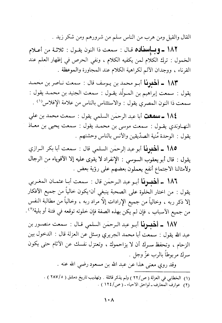 186 - أَخْبَرَنَا أَبُو عَبْدِ الرَّحْمَنِ قَالَ: سَمِعْتُ أَبَا عُثْمَانَ الْمَغْرِبِيَّ يَقُولُ: §«مَنِ اخْتَارَ الْخَلْوَةَ عَلَى الصُّحْبَةِ يَنْبَغِي أَنْ يَكُونَ خَالِيًا مِنْ جَمِيعِ الْأَذْكَارِ إِلَّا ذِكْرَ رَبِّهِ، وَخَالِيًا مِنْ جَمِيعِ الْإِرَادَاتِ إِلَّا مُرَادَ رَبِّهِ، وَخَالِيًا مِنْ مُطَالَبَةِ النَّفْسِ مِنْ جَمِيعِ الْأَسْبَابِ، فَإِنْ لَمْ يَكُنْ بِهَذِهِ الصِّفَةِ، فَإِنَّ خَلْوَتَهُ تُوقِعُهُ فِي فِتْنَةٍ وَبَلِيَّةٍ»