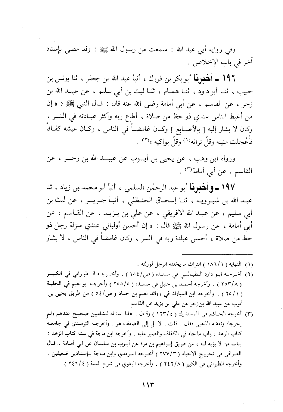 197 - وَأَخْبَرَنَا أَبُو عَبْدِ الرَّحْمَنِ السُّلَمِيُّ، أَنْبَأَنَا أَبُو مُحَمَّدِ بْنُ زِيَادٍ، حَدَّثَنَا عَبْدُ اللَّهِ بْنُ شِيرَوَيْهِ، حَدَّثَنَا إِسْحَاقُ الْحَنْظَلِيُّ، أَنْبَأَنَا جَرِيرٌ، عَنْ لَيْثِ بْنِ أَبِي سُلَيْمٍ، عَنْ عَبْدِ اللَّهِ الْأَفْرِيقِيِّ، عَنْ عَلِيِّ بْنِ يَزِيدَ، عَنِ الْقَاسِمِ، عَنْ أَبِي أُمَامَةَ، عَنْ رَسُولِ اللَّهِ صَلَّى اللهُ عَلَيْهِ وَسَلَّمَ قَالَ: §«إِنَّ أَحْسَنَ أَوْلِيَائِي عِنْدِي مَنْزِلَةً رَجُلٌ ذُو حَظٍّ مِنْ صَلَاةٍ أَحْسَنَ عِبَادَةَ رَبَّهُ فِي السِّرِّ , وَكَانَ غَامِضًا فِي النَّاسِ، لَا يُشَارُ -[114]- إِلَيْهِ بِالْأَصَابِعِ عُجِّلَتْ مَنِيَّتُهُ، وَقَلَّ تُرَاثُهُ، وَقَلَّ بَوَاكِيهِ»