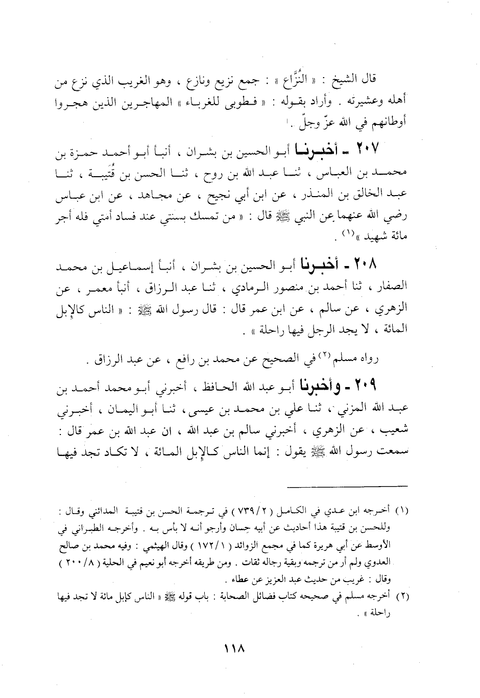 208 - أَخْبَرَنَا أَبُو الْحُسَيْنِ بْنُ بِشْرَانَ، أَنْبَأَنَا إِسْمَاعِيلُ بْنُ مُحَمَّدٍ الصَّفَّارُ، حَدَّثَنَا أَحْمَدُ بْنُ مَنْصُورٍ الرَّمَادِيُّ، حَدَّثَنَا عَبْدُ الرَّزَّاقِ، أَنْبَأَنَا مَعْمَرٌ، عَنِ الزُّهْرِيِّ، عَنْ سَالِمٍ، عَنِ ابْنِ عُمَرَ رَضِيَ اللَّهُ عَنْهُ قَالَ: قَالَ رَسُولُ اللَّهِ صَلَّى اللهُ عَلَيْهِ وَسَلَّمَ: «§النَّاسُ كَالْإِبِلِ الْمِائَةِ، لَا يَجِدُ الرَّجُلُ فِيهَا رَاحِلَةً» رَوَاهُ مُسْلِمٌ فِي الصَّحِيحِ عَنْ مُحَمَّدِ بْنِ رَافِعٍ، عَنْ عَبْدِ الرَّزَّاقِ