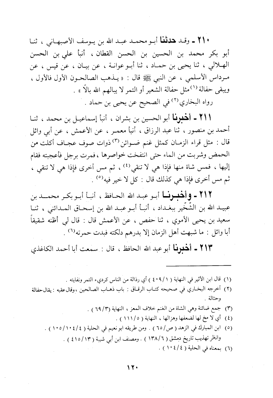 210 - وَقَدْ حَدَّثَنَا أَبُو مُحَمَّدٍ عَبْدُ اللَّهِ بْنُ يُوسُفَ الْهِلَالِيُّ، حَدَّثَنَا يَحْيَى بْنُ حَمَّادٍ، حَدَّثَنَا أَبُو عَوَانَةَ، عَنْ بَيَانٍ، عَنْ قَيْسٍ، عَنْ مِرْدَاسٍ الْأَسْلَمِيِّ، عَنِ النَّبِيِّ صَلَّى اللهُ عَلَيْهِ وَسَلَّمَ قَالَ: §يَذْهَبُ الصَّالِحُونَ الْأَوَّلُ فَالْأَوَّلُ، وَتَبْقَى حُفَالَةٌ مِثْلُ حُفَالَةِ الشَّعِيرِ - أَوِ التَّمْرِ - لَا يُبَالِيهِمُ اللَّهُ بَالًا "، رَوَاهُ الْبُخَارِيُّ فِي الصَّحِيحِ، عَنْ يَحْيَى بْنِ حَمَّادٍ