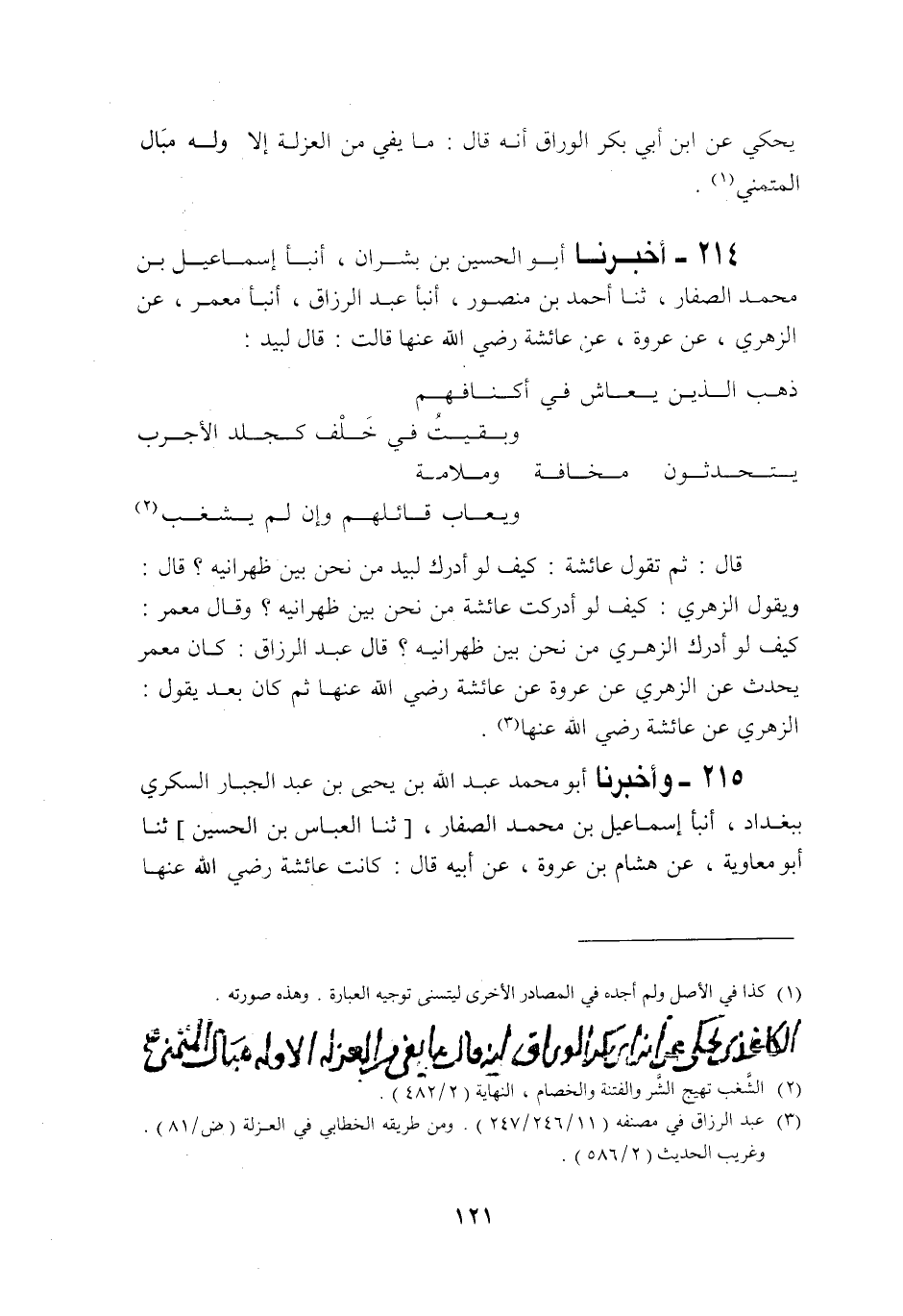 214 - أَخْبَرَنَا أَبُو الْحُسَيْنِ بْنُ بِشْرَانَ، أَنْبَأَنَا إِسْمَاعِيلُ بْنُ مُحَمَّدٍ الصَّفَّارُ، حَدَّثَنَا أَحْمَدُ بْنُ مَنْصُورٍ، ثنا عَبْدُ الرَّزَّاقِ، أَنْبَأَنَا مَعْمَرٌ، عَنِ الزُّهْرِيِّ، عَنْ عُرْوَةَ، عَنْ عَائِشَةَ قَالَتْ: قَالَ لَبِيدٌ: