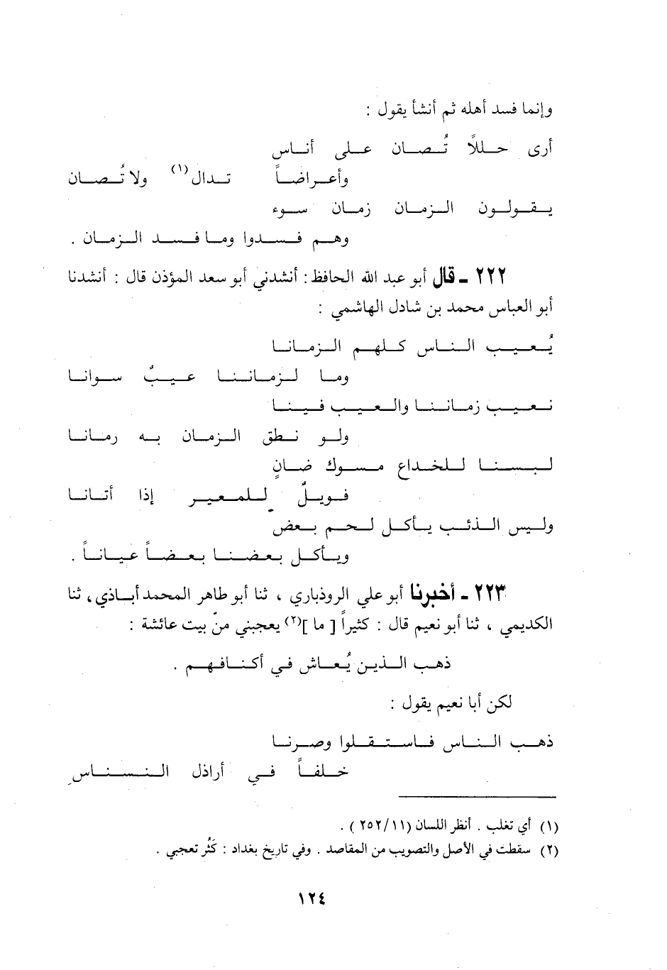 222 - قَالَ أَبُو عَبْدِ اللَّهِ الْحَافِظُ: أَنْشَدَنِي أَبُو سَعْدٍ الْمُؤَذِّنُ قَالَ: أَنْشَدَنَا أَبُو الْعَبَّاسِ مُحَمَّدُ بْنُ شَادِلٍ الْهَاشِمِيُّ: