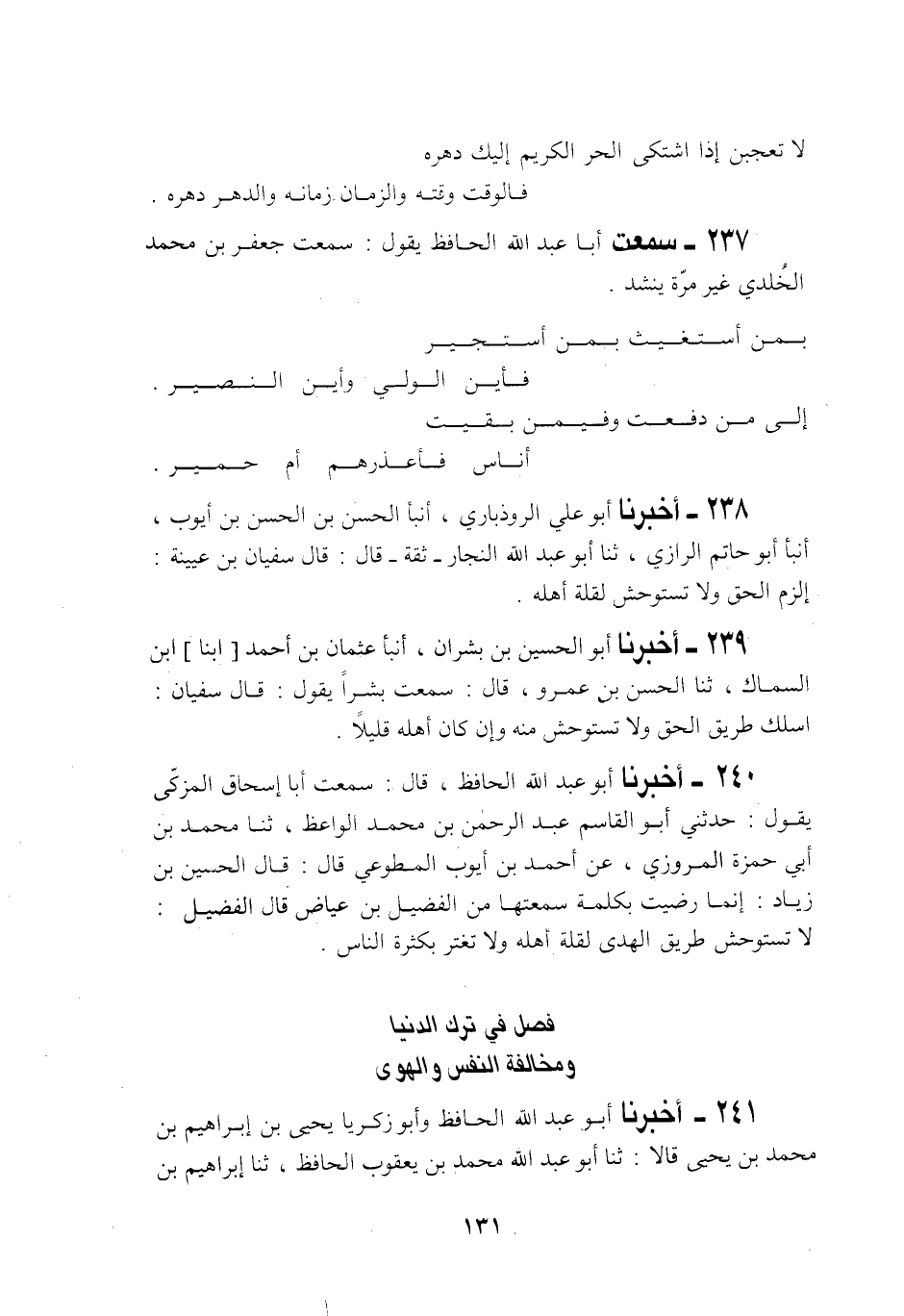 239 - أَخْبَرَنَا أَبُو الْحُسَيْنِ بْنُ بِشْرَانَ، أَنْبَأَنَا عُثْمَانُ بْنُ أَحْمَدَ بْنِ السَّمَّاكِ، حَدَّثَنَا الْحَسَنُ بْنُ عَمْرٍو قَالَ: سَمِعْتُ بِشْرًا يَقُولُ: قَالَ سُفْيَانُ: «§اسْلُكْ طَرِيقَ الْحَقِّ، وَلَا تَسْتَوْحِشْ مِنْهُ وَإِنْ كَانَ أَهْلُهُ قَلِيلًا»