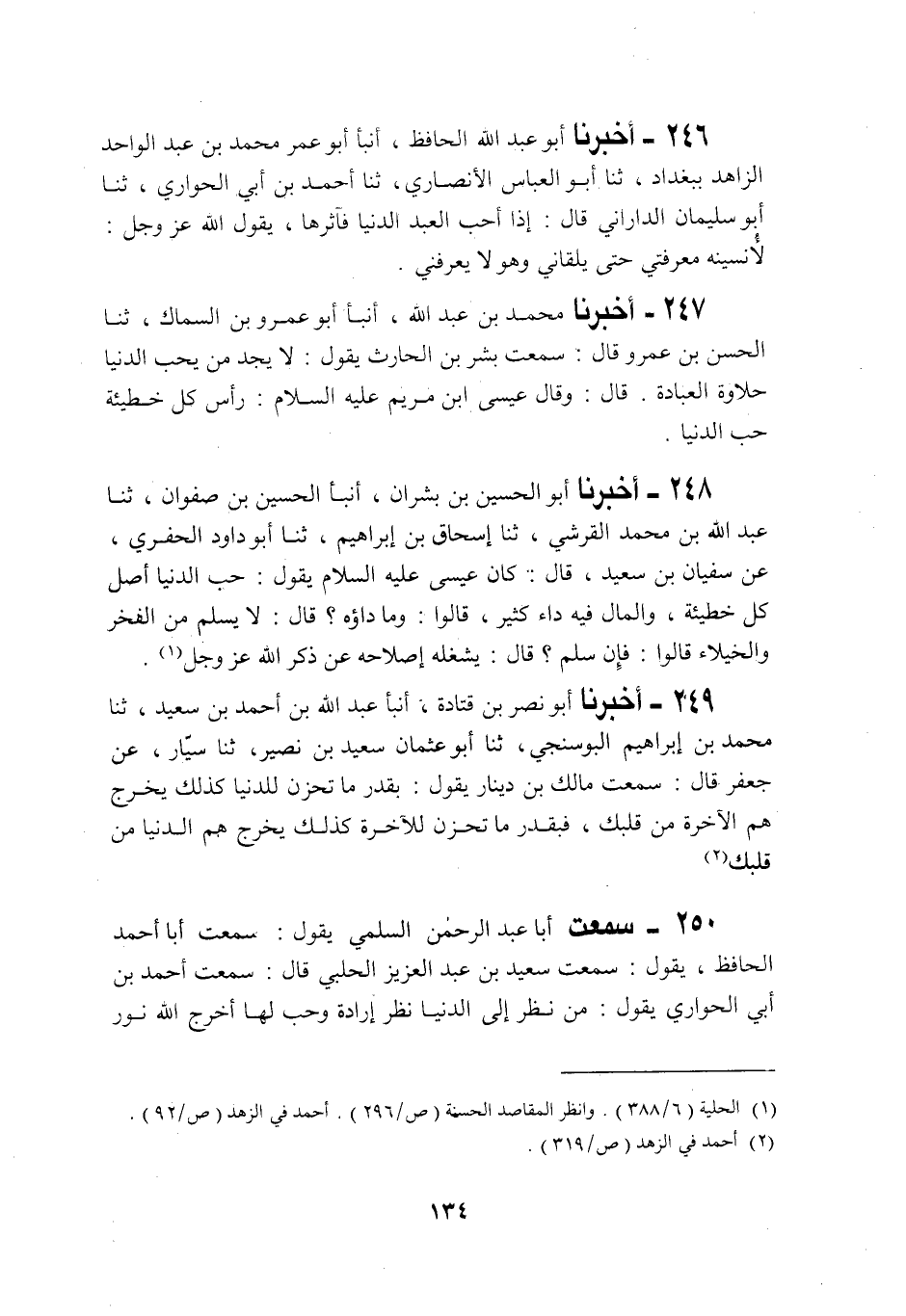 250 - سَمِعْتُ أَبَا عَبْدِ الرَّحْمَنِ السُّلَمِيَّ يَقُولُ: سَمِعْتُ أَبَا أَحْمَدَ الْحَافِظَ يَقُولُ: سَمِعْتُ سَعِيدَ بْنَ عَبْدِ الْعَزِيزِ الْحَلَبِيَّ قَالَ: سَمِعْتُ أَحْمَدَ بْنَ أَبِي الْحَوَارِيِّ يَقُولُ: §«مَنْ نَظَرَ إِلَى الدُّنْيَا نَظَرَ إِرَادَةٍ وَحُبٍّ لَهَا أَخْرَجَ اللَّهُ نُورَ -[135]- الِيَقِينِ، وَالزُّهْدِ مِنْ قَلْبِهِ»