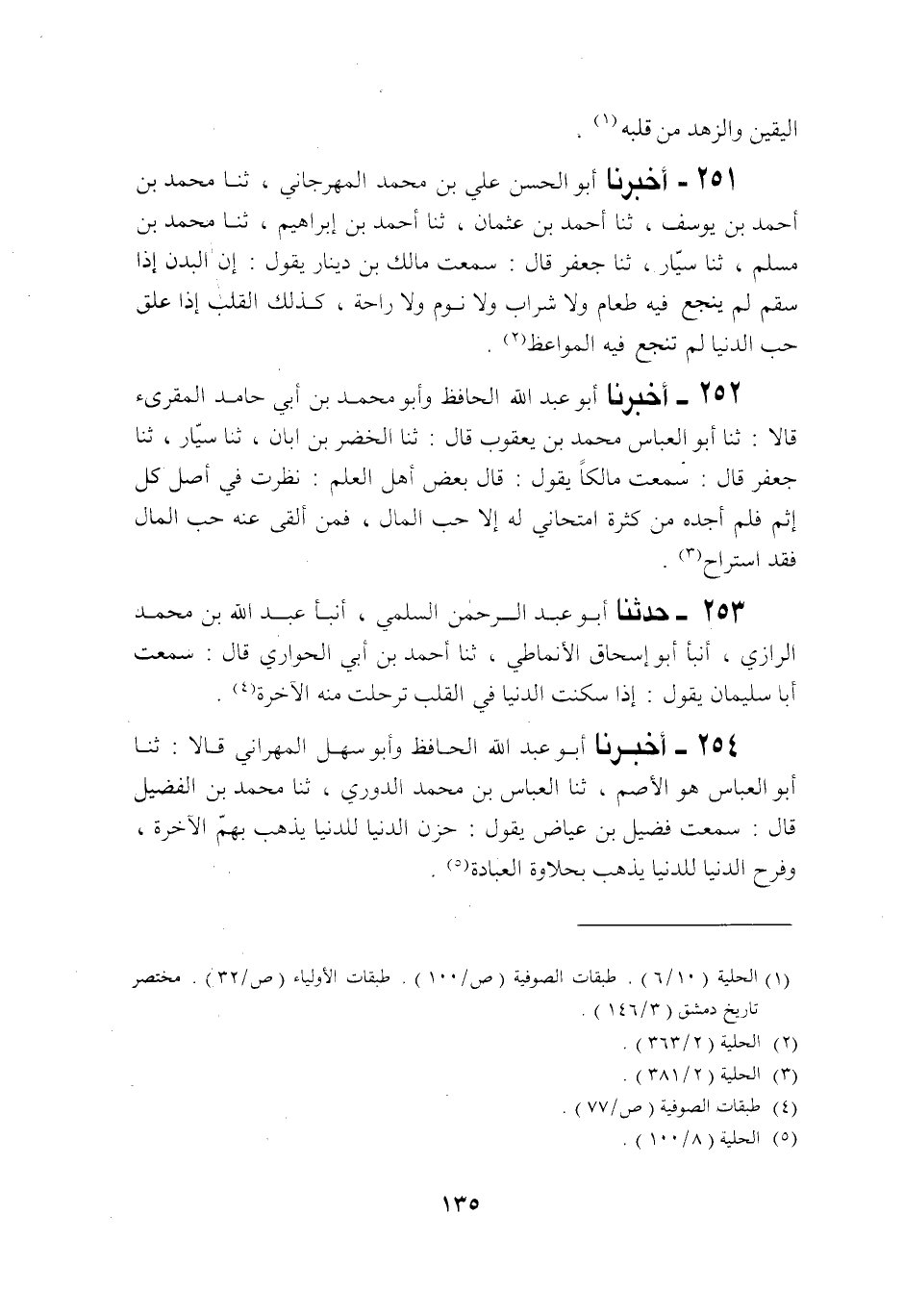 253 - حَدَّثَنَا أَبُو عَبْدِ الرَّحْمَنِ السُّلَمِيُّ، أَنْبَأَنَا عَبْدُ اللَّهِ بْنُ مُحَمَّدٍ الرَّازِيُّ، أَنْبَأَنَا أَبُو إِسْحَاقَ الْأَنْمَاطِيُّ، حَدَّثَنَا أَحْمَدُ بْنُ الْحَوَارِيِّ قَالَ: سَمِعْتُ أَبَا سُلَيْمَانَ يَقُولُ: §«إِذَا سَكَنَتِ الدُّنْيَا فِي الْقَلْبِ تَرَحَّلَتْ عَنْهُ الْآخِرَةُ»