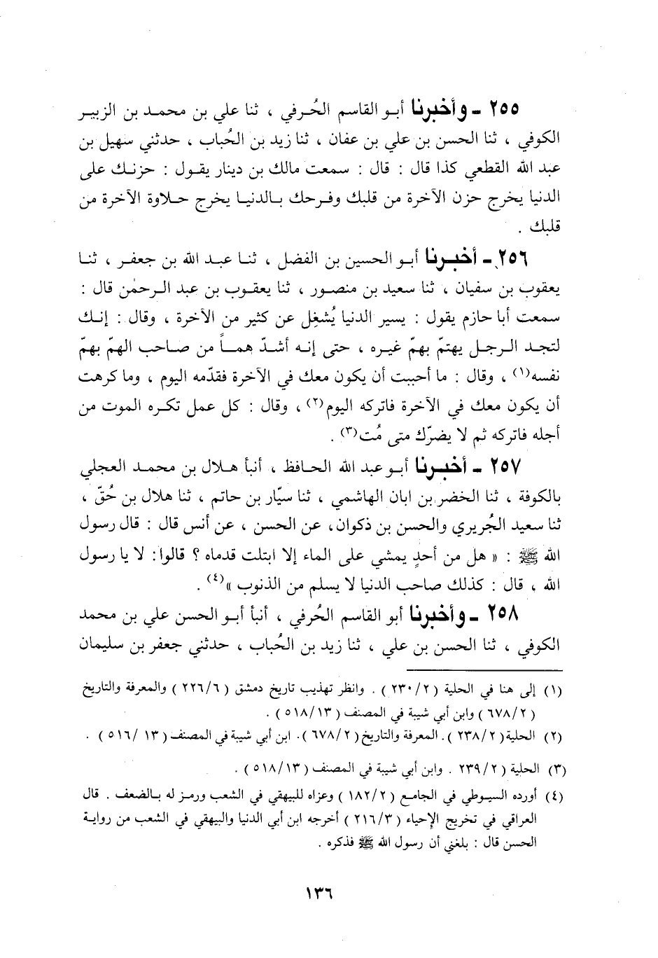 255 - وَأَخْبَرَنَا أَبُو الْقَاسِمِ الْحُرْفِيُّ، حَدَّثَنَا عَلِيُّ بْنُ مُحَمَّدِ بْنِ الزُّبَيْرِ الْكُوفِيُّ، حَدَّثَنَا الْحَسَنُ بْنُ عَلِيِّ بْنِ عَفَّانَ، حَدَّثَنَا زَيْدُ بْنُ الْحُبَابِ، حَدَّثَنِي سُهَيْلُ بْنُ عَبْدِ اللَّهِ الْقُطَعِيُّ، كَذَا قَالَ: قَالَ، سَمِعْتُ مَالِكَ بْنَ دِينَارٍ يَقُولُ: «§حُزْنُكَ عَلَى الدُّنْيَا يُخْرِجُ حُزْنَ الْآخِرَةِ مِنْ قَلْبِكَ، وَفَرَحُكَ بِالدُّنْيَا يُخْرِجُ حَلَاوَةَ الْآخِرَةَ مِنْ قَلْبِكَ»