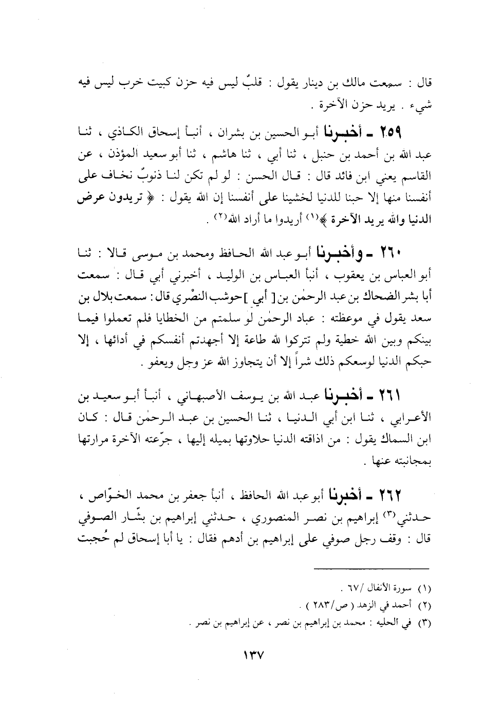 259 - أَخْبَرَنَا أَبُو الْحُسَيْنِ بْنُ بِشْرَانَ، أَنْبَأَنَا إِسْحَاقُ الْكَاذِيُّ، حَدَّثَنَا عَبْدُ اللَّهِ بْنُ أَحْمَدَ بْنِ حَنْبَلٍ، حَدَّثَنَا هَاشِمٌ، حَدَّثَنَا أَبُو سَعِيدٍ الْمُؤَذِّنُ، عَنِ الْقَاسِمِ يَعْنِي ابْنِ فَائِدٍ قَالَ: قَالَ الْحَسَنُ: §" لَوْ لَمْ تَكُنْ لَنَا ذُنُوبٌ نَخَافُ عَلَى أَنْفُسِنَا مِنْهَا إِلَّا حُبَّنَا لِلدُّنْيَا، لَخَشِيَنَا عَلَى أَنْفُسِنَا، إِنَّ اللَّهَ يَقُولُ: {تُرِيدُونَ عَرَضَ الدُّنْيَا وَاللَّهُ يُرِيدُ الْآخِرَةَ} [الأنفال: 67] ، أَرِيدُوا مَا أَرَادَ اللَّهُ "