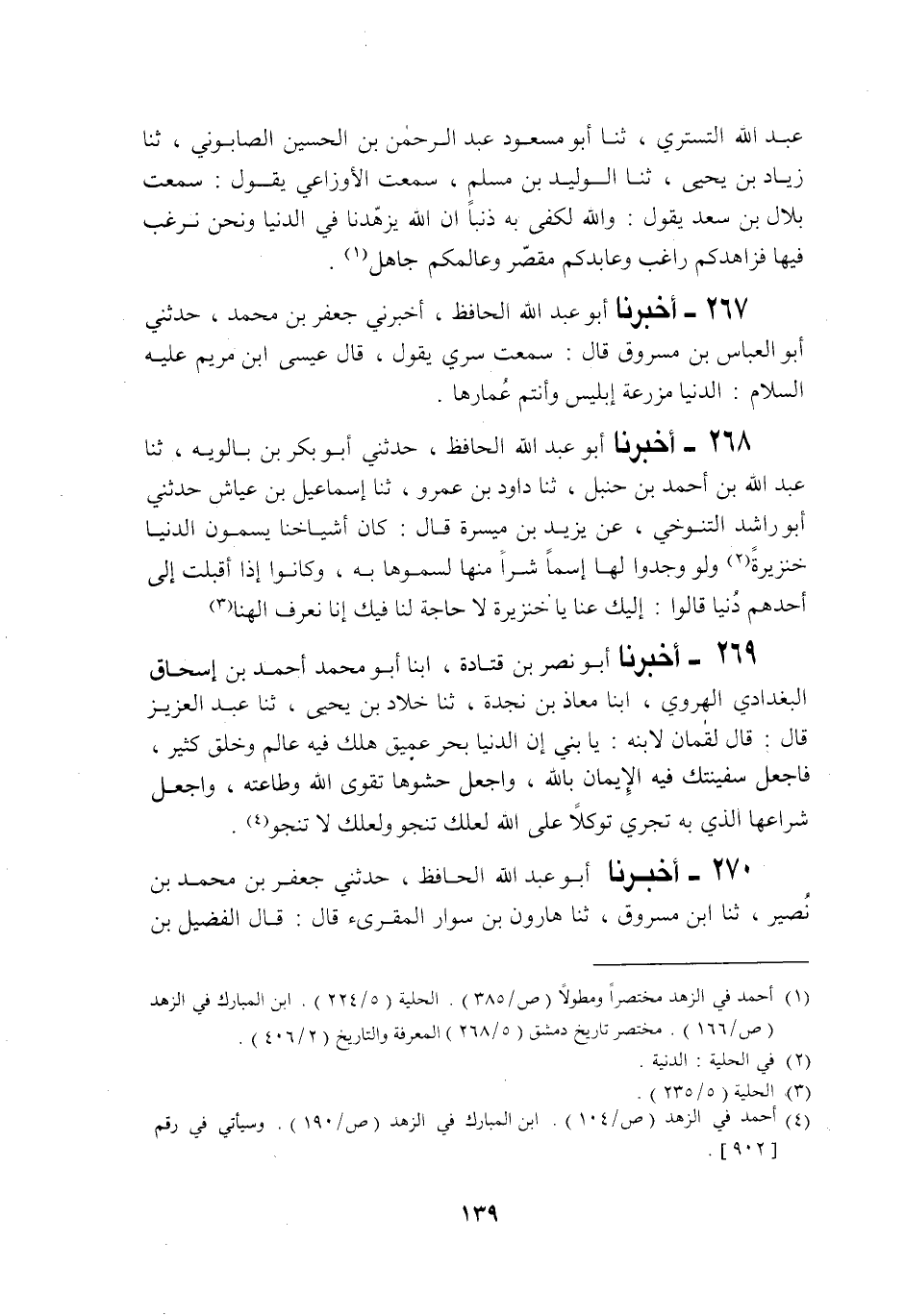 268 - أَخْبَرَنَا أَبُو عَبْدِ اللَّهِ الْحَافِظُ، حَدَّثَنِي أَبُو بَكْرِ بْنُ بَالَوَيْهِ، حَدَّثَنَا عَبْدُ اللَّهِ بْنُ أَحْمَدَ بْنِ حَنْبَلٍ، حَدَّثَنَا دَاوُدُ بْنُ عَمْرٍو، حَدَّثَنَا إِسْمَاعِيلُ بْنُ عَيَّاشٍ، حَدَّثَنِي أَبُو رَاشِدٍ التَّنُوخِيُّ، عَنْ يَزِيدَ بْنِ مَيْسَرَةَ قَالَ: «كَانَ §أَشْيَاخُنَا يُسَمُّونَ الدُّنْيَا خِنْزِيرَةً وَلَوْ وَجَدُوا لَهَا اسْمًا شَرًّا مِنْهَا لَسَمَّوْهَا بِهِ، وَكَانُوا إِذَا أَقْبَلَتْ إِلَى أَحَدِهِمْ دُنْيَا» ، قَالُوا: «إِلَيْكِ عَنَّا يَا خِنْزِيرَةُ لَا حَاجَةَ لَنَا فِيكِ إِنَّا نَعْرِفُ الْهَنَا»