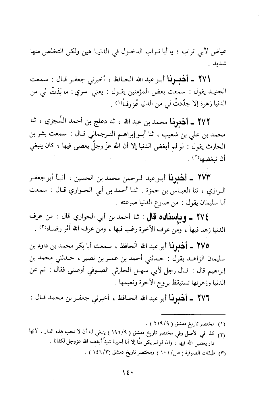 271 - أَخْبَرَنَا عَبْدُ اللَّهِ الْحَافِظُ، أَخْبَرَنِي جَعْفَرٌ قَالَ: سَمِعْتُ الْجُنَيْدَ يَقُولُ: سَمِعْتُ بَعْضَ الْمُؤْمِنِينَ يَقُولُ - يَعْنِي سَرِيًّا: §«مَا بَدَتْ لِي مِنَ الدُّنْيَا زَهْرَةٌ إِلَّا جَدَّدْتُ لِي مِنَ الدُّنْيَا عُزُوفًا»