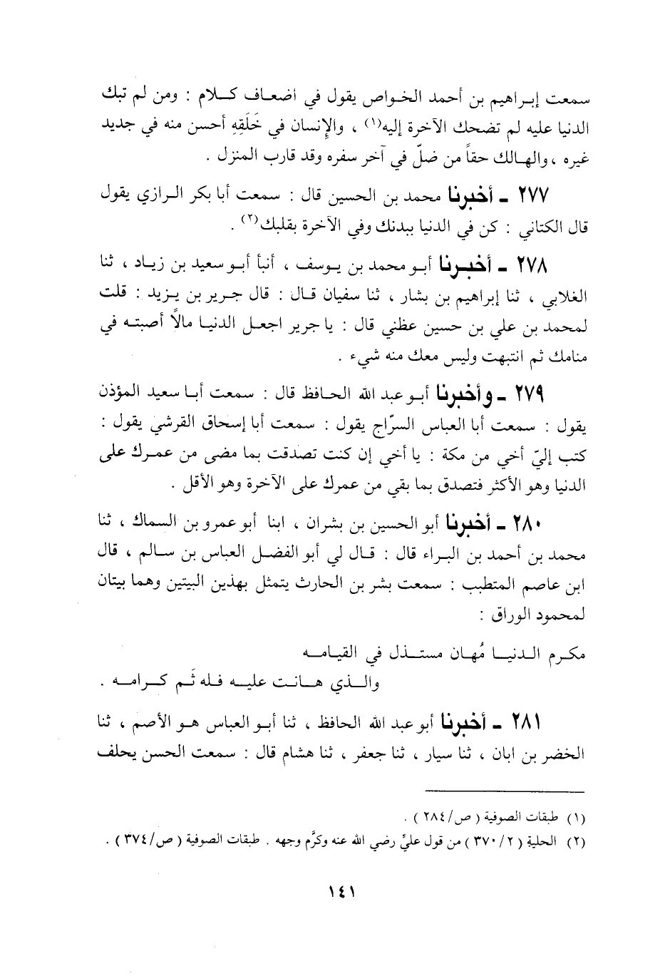 280 - أَخْبَرَنَا أَبُو الْحُسَيْنِ بْنُ بِشْرَانَ، أَنْبَأَنَا أَبُو عَمْرِو بْنُ السَّمَّاكِ، حَدَّثَنَا مُحَمَّدُ بْنُ أَحْمَدَ الْبَرَاءُ قَالَ: قَالَ لِي أَبُو الْفَضْلِ الْعَبَّاسُ بْنُ بَسَّامٍ: قَالَ ابْنُ عَاصِمٍ الْمُتَطَبِّبُ: سَمِعْتُ بِشْرَ بْنَ الْحَارِثِ، يَتَمَثَّلُ بِهَذَيْنِ الْبَيْتَيْنِ، وَهُمَا بَيْتَانِ لِمَحْمُودٍ الْوَرَّاقِ: