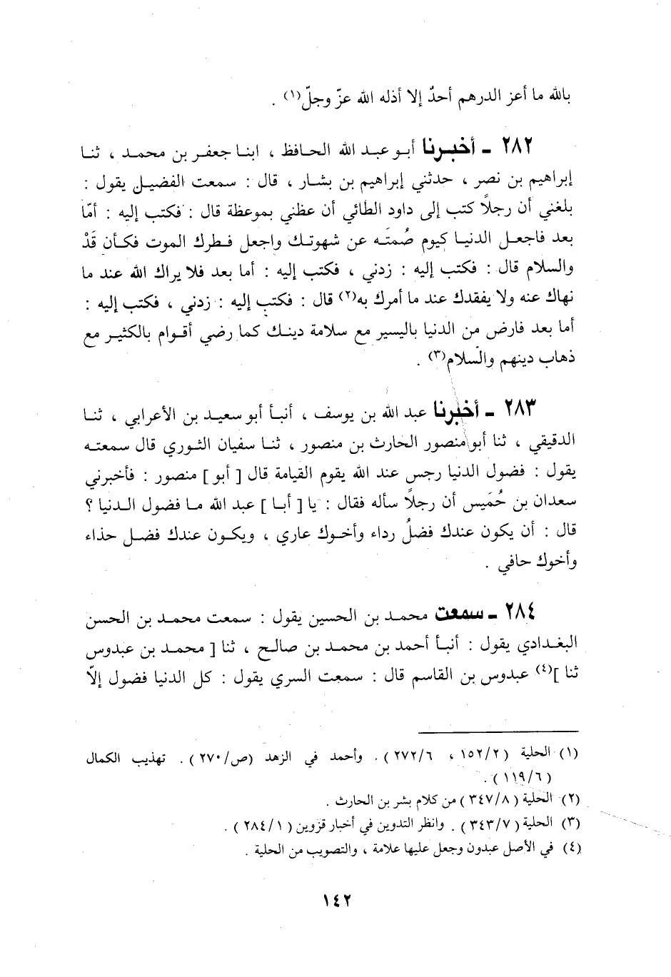 284 - سَمِعْتُ مُحَمَّدَ بْنَ الْحُسَيْنِ يَقُولُ: سَمِعْتُ مُحَمَّدَ بْنَ الْحَسَنِ الْبَغْدَادِيَّ، أَنْبَأَنَا أَحْمَدُ بْنُ مُحَمَّدِ بْنِ صَالِحٍ، حَدَّثَنَا مُحَمَّدُ بْنُ عَبْدُونَ، قَالَ: حَدَّثَنَا عَبْدُوسُ بْنُ الْقَاسِمِ قَالَ: سَمِعْتُ السَّرِيَّ يَقُولُ: " §كُلُّ الدُّنْيَا فُضُولٌ إِلَّا -[143]- خَمْسَ خِصَالٍ: خُبْزٌ يُشْبِعُهُ، وَمَاءٌ يُرْوِيهِ، وَثَوْبٌ يَسْتُرُهُ، وَبَيْتٌ يُكِنُّهُ، وَعِلْمٌ يَسْتَعْمِلُهُ "