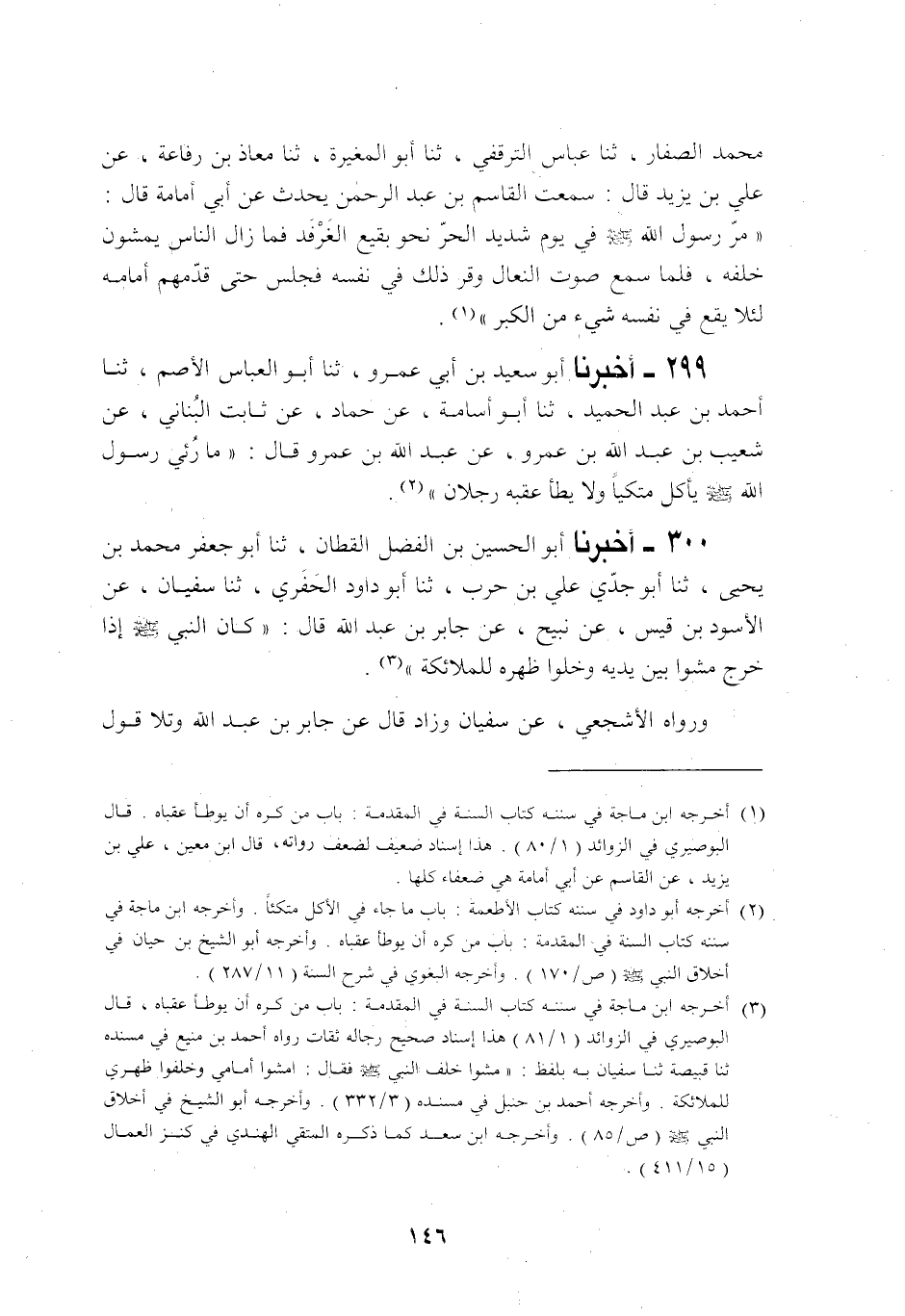 299 - أَخْبَرَنَا أَبُو سَعِيدِ بْنُ أَبِي عَمْرٍو، حَدَّثَنَا أَبُو الْعَبَّاسِ الْأَصَمُّ، حَدَّثَنَا أَحْمَدُ بْنُ عَبْدِ الْحَمِيدِ، حَدَّثَنَا أَبُو أُسَامَةَ، عَنْ حَمَّادٍ، عَنْ ثَابِتٍ الْبُنَانِيِّ، عَنْ شُعَيْبِ بْنِ عَبْدِ اللَّهِ بْنِ عَمْرٍو، عَنْ عَبْدِ اللَّهِ بْنِ عَمْرٍو رَضِيَ اللَّهُ عَنْهُ قَالَ: §«مَا رُئِيَ رَسُولُ اللَّهِ صَلَّى اللهُ عَلَيْهِ وَسَلَّمَ يَأْكُلُ مُتَّكِئًا وَلَا يَطَأُ عَقِبَهُ رَجُلَانِ»