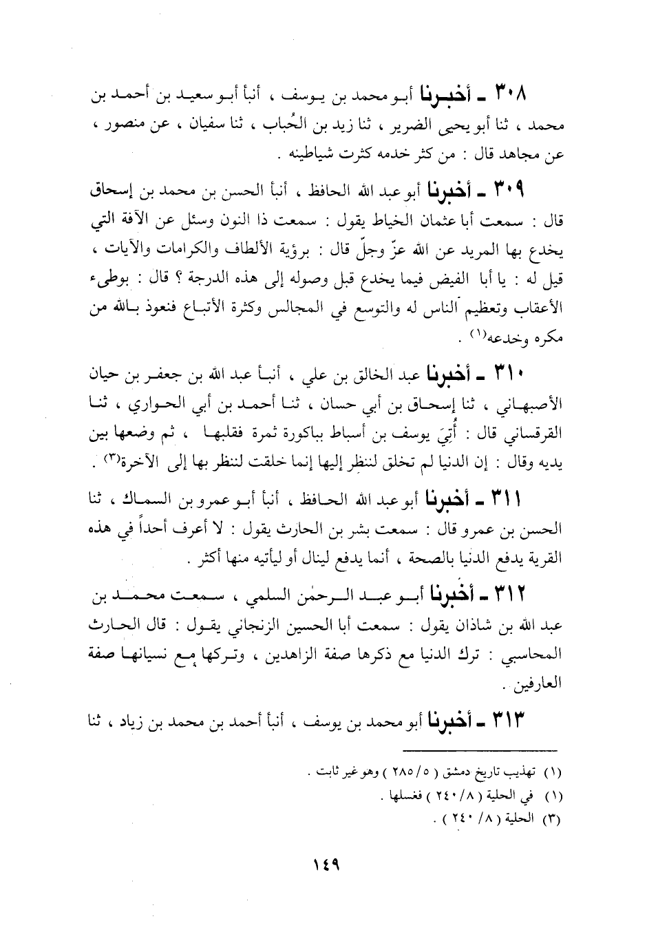 312 - أَخْبَرَنَا أَبُو عَبْدِ الرَّحْمَنِ السُّلَمِيُّ، سَمِعْتُ مُحَمَّدَ بْنَ عَبْدِ اللَّهِ بْنِ شَاذَانَ يَقُولُ: سَمِعْتُ أَبَا الْحُسَيْنِ الزِّنْجَانِيَّ يَقُولُ: قَالَ الْحَارِثُ الْمُحَاسَبِيُّ: «§تَرْكُ الدُّنْيَا مَعَ ذِكْرِهَا صِفَةُ الزَّاهِدِينَ، وَتَرْكُهَا مَعَ نِسْيَانِهَا صِفَةُ الْعَارِفِينَ»