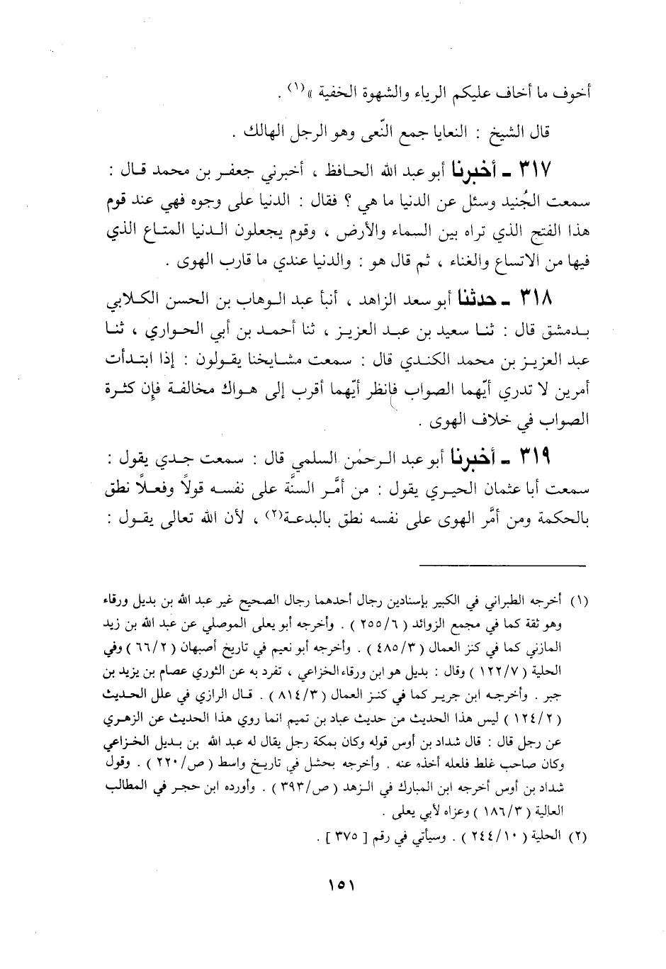 318 - حَدَّثَنَا أَبُو سَعْدٍ الزَّاهِدُ، أَنْبَأَنَا عَبْدُ الْوَهَّابِ بْنُ الْحَسَنِ الْكِلَابِيُّ، بِدِمَشْقَ قَالَ: حَدَّثَنَا سَعِيدُ بْنُ عَبْدِ الْعَزِيزِ، حَدَّثَنَا أَحْمَدُ بْنُ أَبِي الْحَوَارِيِّ، حَدَّثَنَا عَبْدُ الْعَزِيزِ بْنُ مُحَمَّدٍ الْكِنْدِيُّ قَالَ: سَمِعْتُ مَشَايِخَنَا يَقُولُونَ: §«إِذَا ابْتَدَأْتَ فِي أَمْرِينَ لَا تَدْرِي أَيُّهُمَا الصَّوَابُ فَانْظُرْ أَيُّهُمَا أَقْرَبُ إِلَى هَوَاكَ فَخَالِفْهُ؛ فَإِنَّ كَثْرَةَ الصَّوَابِ فِي خِلَافِ الْهَوَى»