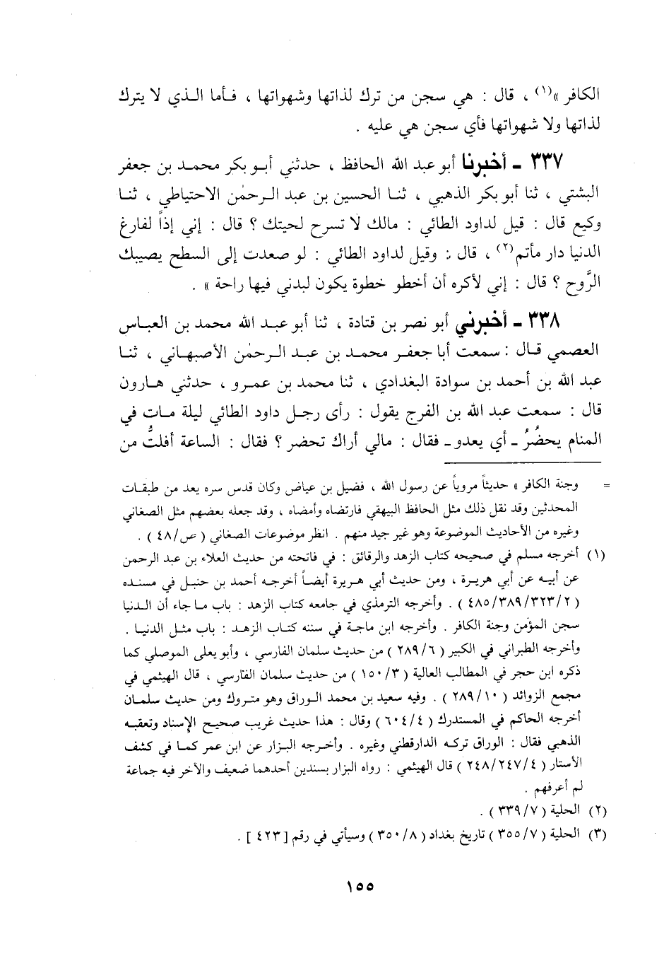 338 - أَخْبَرَنِي أَبُو نَصْرِ بْنُ قَتَادَةَ، حَدَّثَنَا أَبُو عَبْدِ اللَّهِ مُحَمَّدُ بْنُ الْعَبَّاسِ الْعِصَمِيُّ قَالَ: سَمِعْتُ أَبَا جَعْفَرٍ مُحَمَّدَ بْنَ عَبْدِ الرَّحْمَنِ الْأَصْبَهَانِيَّ، حَدَّثَنَا عَبْدُ اللَّهِ بْنُ أَحْمَدَ بْنِ سَوَادَةَ الْبَغْدَادِيُّ، حَدَّثَنَا مُحَمَّدُ بْنُ عَمْرٍو، حَدَّثَنِي هَارُونُ قَالَ: سَمِعْتُ عَبْدَ اللَّهِ بْنَ الْفَرَجِ يَقُولُ: رَأَى رَجُلٌ دَاوُدَ الطَّائِيَّ لَيْلَةً مَاتَ فِي الْمَنَامِ يَحْضُرُ - أَيْ يَعْدُو - فَقَالَ: مَالِي أَرَاكَ تَحْضُرُ؟ فَقَالَ: §«السَّاعَةَ أَفْلَتُّ مِنَ -[156]- السِّجْنِ فَأَصْبَحَ الرَّجُلُ وَالنَّاسُ» يَقُولُونَ مَاتَ دَاوُدُ رَحِمَهُ اللَّهُ