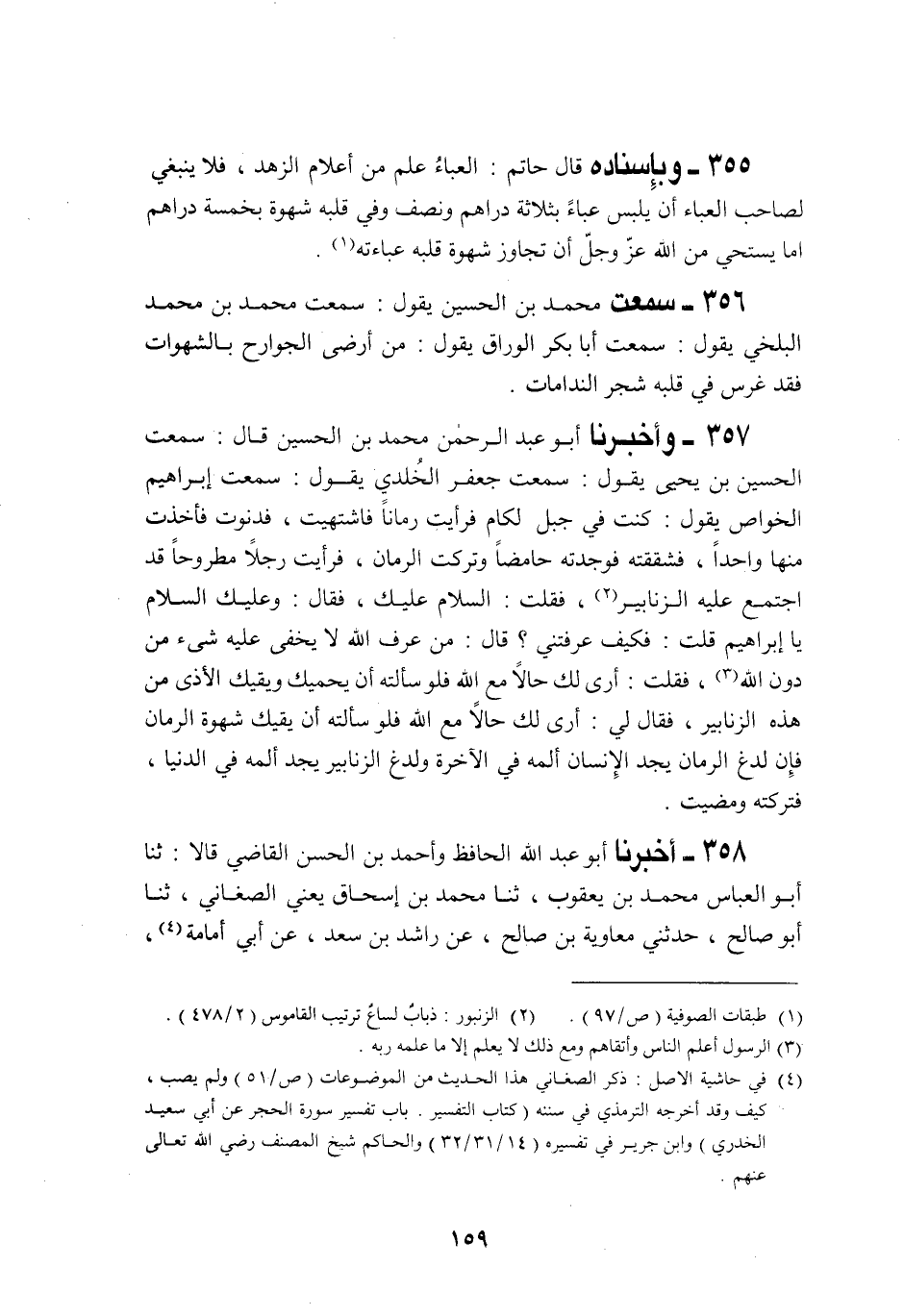 355 - وَبِإِسْنَادِهِ قَالَ حَاتِمٌ: §«الْعَبَاءُ عَلَمٌ مِنْ أَعْلَامِ الزُّهْدِ فَلَا يَنْبَغِي لِصَاحِبِ الْعَبَاءِ أَنْ يَلْبَسَ عَبَاءً بِثَلَاثَةِ دَرَاهِمَ وَنِصْفٍ وَفِي قَلْبِهِ شَهْوَةٌ بِخَمْسَةِ دَرَاهِمَ، أَمَا يَسْتَحِي مِنَ اللَّهِ عَزَّ وَجَلَّ أَنْ تُجَاوِزَ شَهْوَةُ قَلْبِهِ عَبَاءَتَهُ»