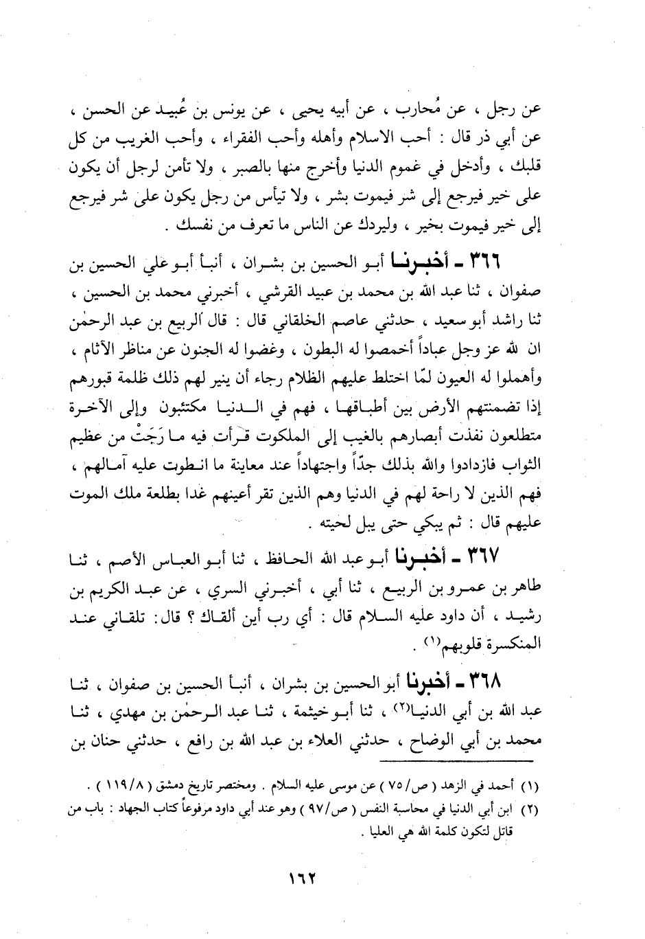 366 - أَخْبَرَنَا أَبُو الْحُسَيْنِ بْنُ بِشْرَانَ، أَنْبَأَنَا أَبُو عَلِيٍّ الْحُسَيْنُ بْنُ صَفْوَانَ، حَدَّثَنَا عَبْدُ اللَّهِ بْنُ مُحَمَّدِ بْنِ عُبَيْدٍ الْقُرَشِيُّ، أَخْبَرَنِي مُحَمَّدُ بْنُ الْحُسَيْنِ، حَدَّثَنَا رَاشِدٌ أَبُو سَعِيدٍ، حَدَّثَنِي عَاصِمٌ الْخُلْقَانِيُّ قَالَ: قَالَ الرَّبِيعُ بْنُ عَبْدِ الرَّحْمَنِ: " إِنَّ §لِلَّهِ عَزَّ وَجَلَّ عِبَادًا أَخْمَصُوا لَهُ الْبُطُونَ، وَغَضُّوا لَهُ الْجُفُونَ عَنْ مَنَاظِرِ الْآثَامِ، وَأَهْمَلُوا لَهُ الْعُيُونَ لَمَّا اخْتَلَطَ عَلَيْهِمُ الظَّلَامُ؛ رَجَاءَ أَنْ يُنِيرَ لَهُمْ ذَلِكَ ظُلْمَةَ قُبُورِهِمْ إِذَا تَضَمَّنَتْهُمُ الْأَرْضُ بَيْنَ أَطْبَاقِهَا، فَهُمْ فِي الدُّنْيَا مُكْتَئِبُونَ وَإِلَى الْآخِرَةِ مُتَطَلِّعُونَ، نَفَذَتْ أَبْصَارُهُمْ بِالْغَيْبِ إِلَى الْمَلَكُوتِ فَرَأَتْ فِيهِ مَا رَجَتْ مِنْ عَظِيمِ الثَّوَابِ فَازْدَادُوا وَاللَّهِ بِذَلِكَ جِدًّا وَاجْتِهَادًا عِنْدَ مُعَايَنَةِ مَا انْطَوَتْ عَلَيْهِ آمَالُهُمْ فَهُمُ الَّذِينَ لَا رَاحَةَ لَهُمْ فِي الدُّنْيَا وَهُمُ الَّذِينَ تَقَرُّ أَعْيُنُهُمْ غَدًا بِطَلْعَةِ مَلِكِ الْمَوْتِ عَلَيْهِمْ قَالَ: ثُمَّ يَبْكِي حَتَّى تُبَلَّ لِحْيَتُهُ "