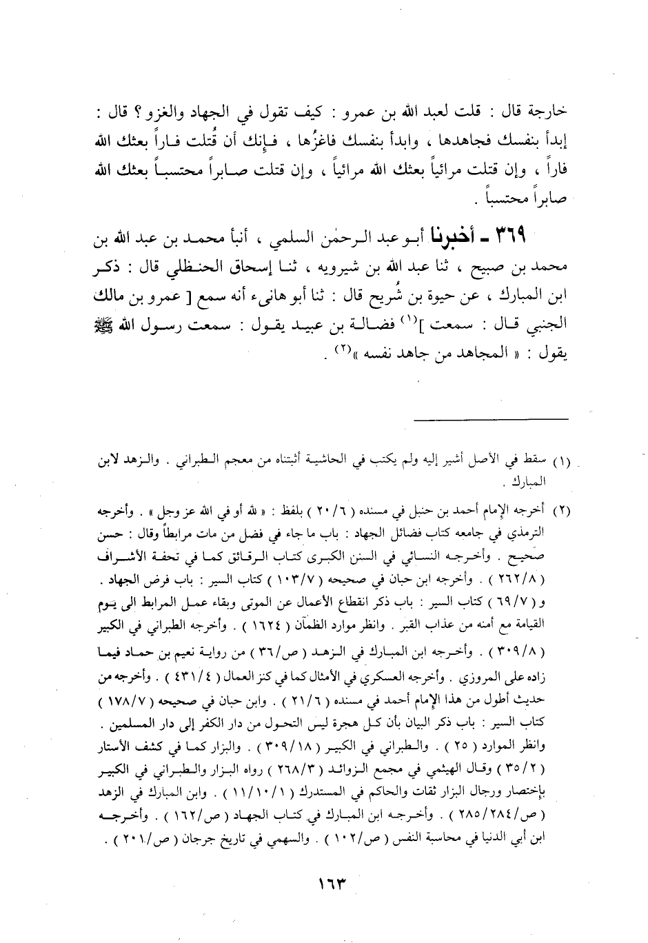 369 - أَخْبَرَنَا أَبُو عَبْدِ الرَّحْمَنِ السُّلَمِيُّ، أَنْبَأَنَا مُحَمَّدُ بْنُ عَبْدِ اللَّهِ بْنِ مُحَمَّدِ بْنِ صُبَيْحٍ، حَدَّثَنَا عَبْدُ اللَّهِ بْنُ شِيرَوَيْهِ، حَدَّثَنَا إِسْحَاقُ الْحَنْظَلِيُّ قَالَ: ذَكَرَ ابْنُ الْمُبَارَكِ، عَنْ حَيْوَةَ بْنِ شُرَيْحٍ قَالَ: حَدَّثَنَا أَبُو هَانِئٍ أَنَّهُ سَمِعَ فَضَالَةَ بْنَ عُبَيْدٍ يَقُولُ: سَمِعْتُ رَسُولَ اللَّهِ صَلَّى اللهُ عَلَيْهِ وَسَلَّمَ يَقُولُ: §«الْمُجَاهِدُ مَنْ جَاهَدَ نَفْسَهُ»