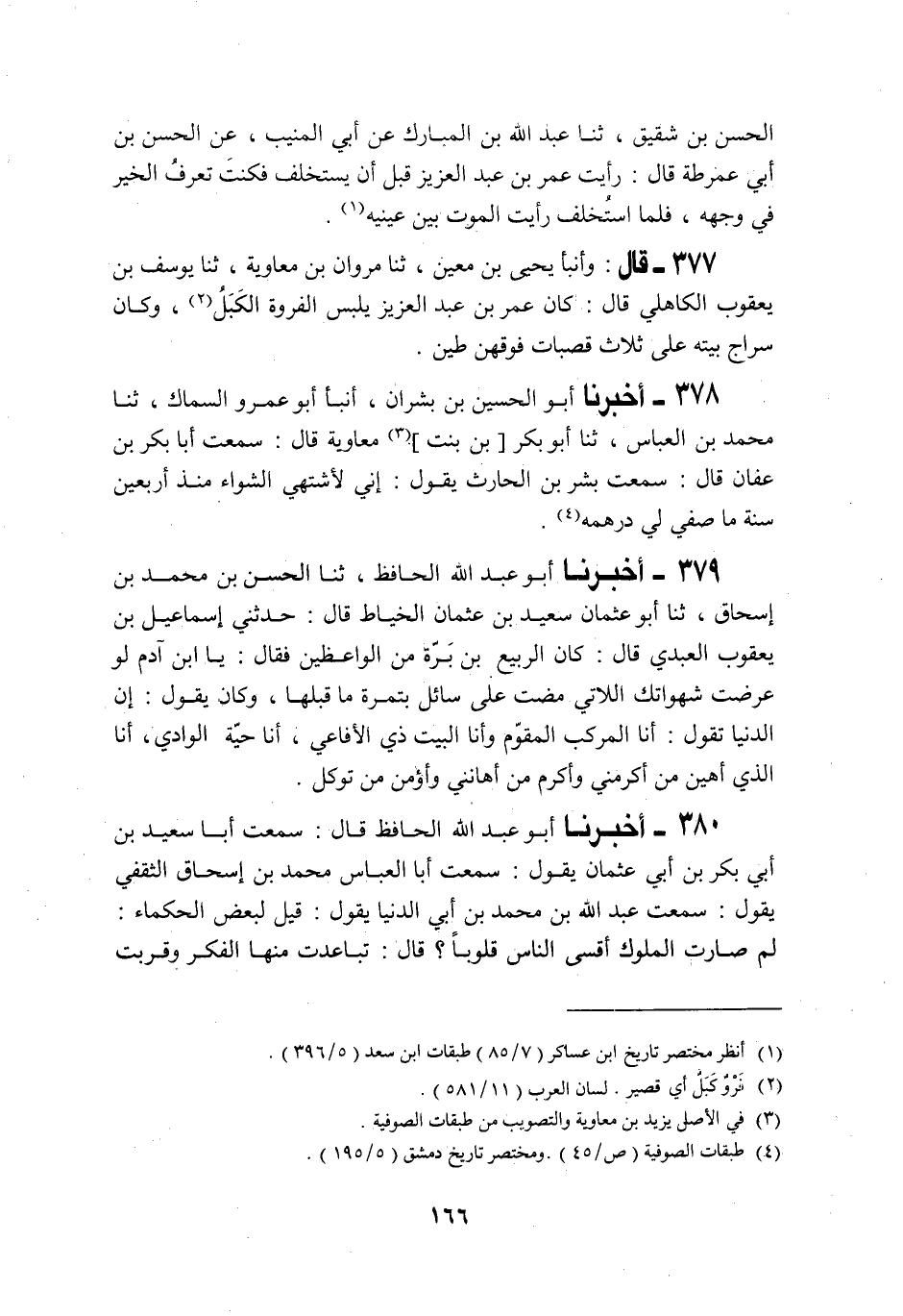 378 - أَخْبَرَنَا أَبُو الْحُسَيْنِ بْنُ بِشْرَانَ، أَنْبَأَنَا أَبُو عَمْرٍو السَّمَّاكِ، حَدَّثَنَا مُحَمَّدُ بْنُ الْعَبَّاسِ، حَدَّثَنَا أَبُو بَكْرِ بْنُ زَيْدِ بْنِ مُعَاوِيَةَ قَالَ: سَمِعْتُ أَبَا بَكْرِ بْنَ عُثْمَانَ قَالَ: سَمِعْتُ بِشْرَ بْنَ الْحَارِثِ يَقُولُ: «§إِنِّي لَأَشْتَهِيَ الشِّوَاءَ مُنْذُ أَرْبَعِينَ سَنَةً، مَا صَفَى لِي دِرْهَمُهُ»
